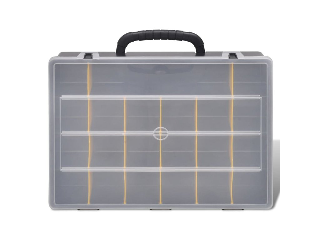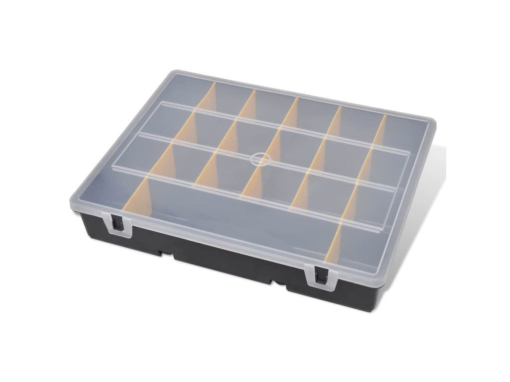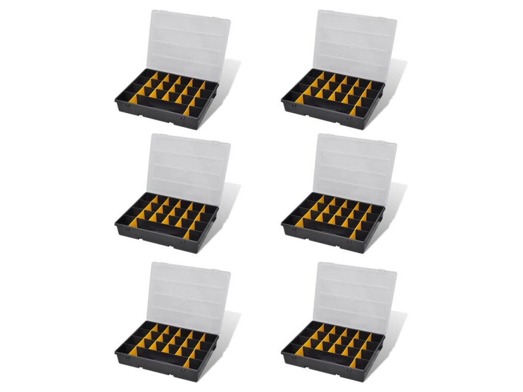 Robustní plastová sada boxů na nářadí se skládá ze 6 kusů a je ideálním pomocníkem na odkládání šroubů , matic a jiných drobných pomůcek . Každý box má 21 částí , které vám pomohou udržet pořádek v drobnostech a zajistit jejich pohodlné používání . Sada je vyrobena z kvalitního polypropylenu , má vysokou tepelnou odolnost , je odolná vůči rzi a trvanlivá. Díky madlu je box přenosný . Bude vynikajícím pomocníkem jak si uspořádat vaše pomůcky . Dodáváme 6 ks boxů na nářadí .