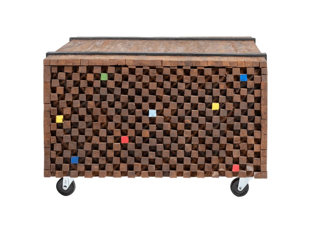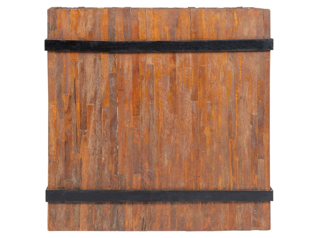 Náš odkládací stolek je vyroben z krásného tvrdého teaku, který mu propůjčuje pevnost. Je navržen tak, aby připomínal stoh trámů spojený černými pásy. Nabízí dostatek prostoru pro odkládání nápojů či pro umístění váz, květin, mísy s ovocem a dalších dekorativních předmětů. Povrchová úprava v přírodní barvě usnadňuje jeho čištění. Rustický stolek také disponuje čtyřmi kolečky, díky nímž se snadno přesouvá.