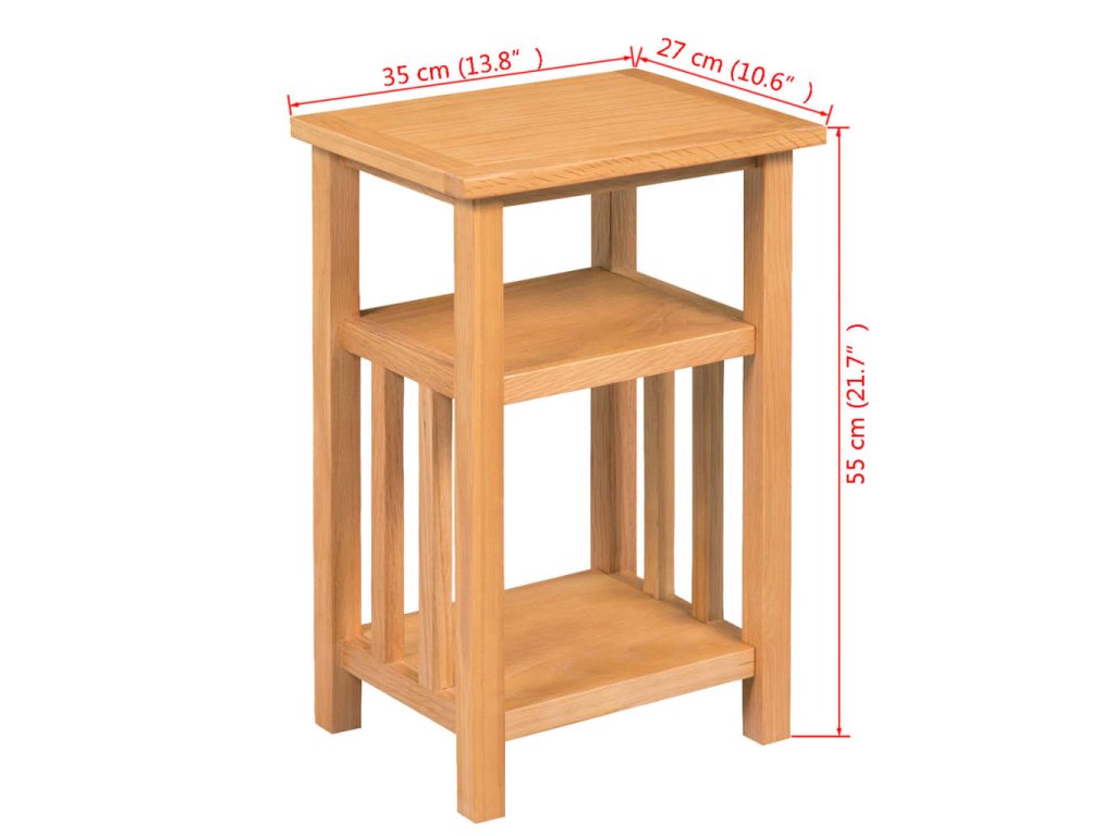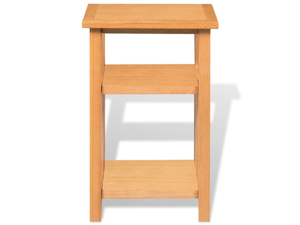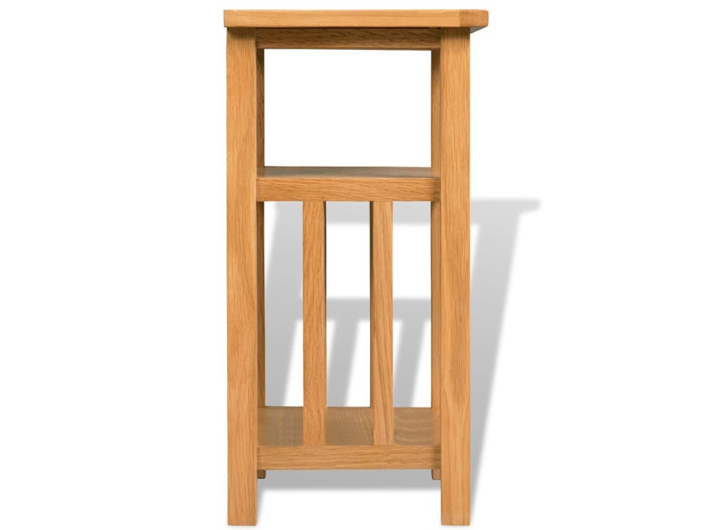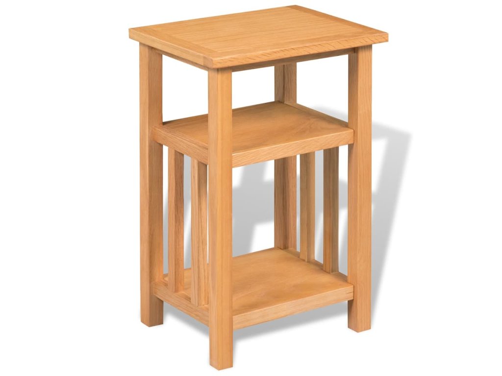 Tento odkládací stolek byl odborně vyrobený z odolného masivního dubového dřeva a je velmi funkční. Kompaktní design odkládacího stolku šetří místo a umožňuje snadné přemisťování. Robustní stolek je ideální pro vystavování dekorativních předmětů, zarámovaných fotografií nebo rostlin v květináčích. Má také 2 police, z nichž jedna je ideální pro ukládání novin a časopisů.