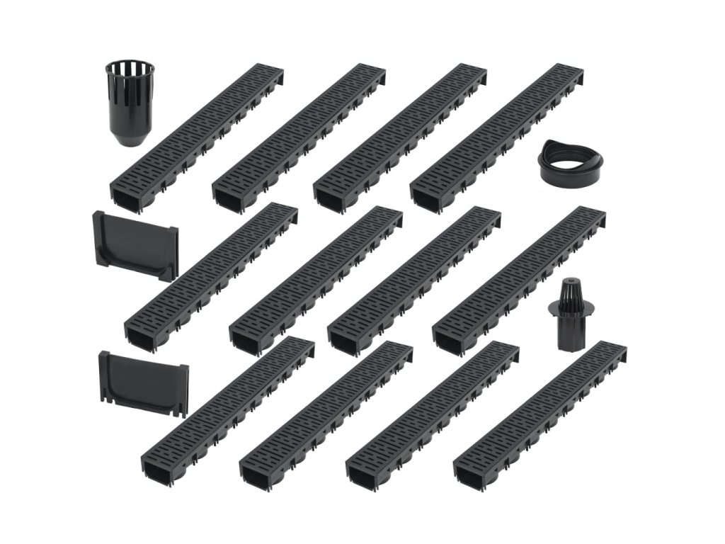 Komplexní sada obsahuje 12 odtokových kanálů s plastovými mřížkami, 1 filtrační systém, 1 spodní výstupní konektor a 2 koncové uzávěry. Představuje dokonalé řešení pro zachycování a odvádění přebytečné vody z příjezdových cest, dvorků a jiných venkovních prostor.