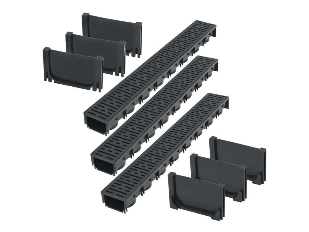 Tato kompletní sada sestává ze 3 odtokových kanálů (každý s plastovou mřížkou) a 6 koncových uzávěrů. Představuje dokonalé řešení pro zachycování a odvádění přebytečné vody z příjezdových cest, dvorků a jiných venkovních prostor.