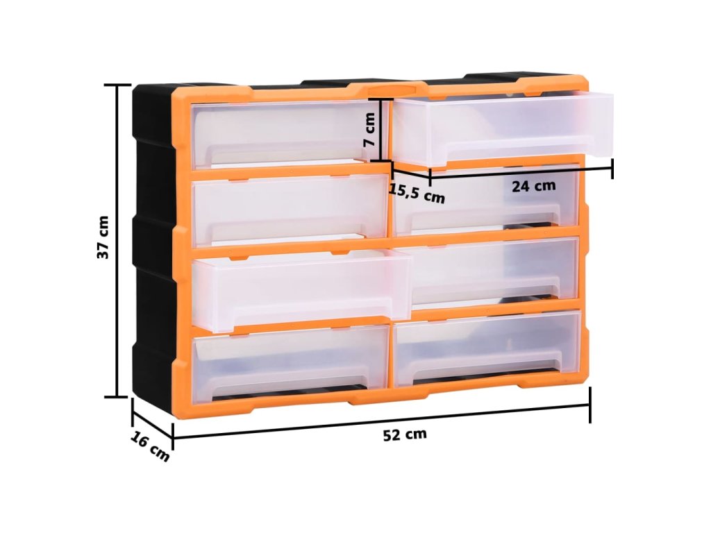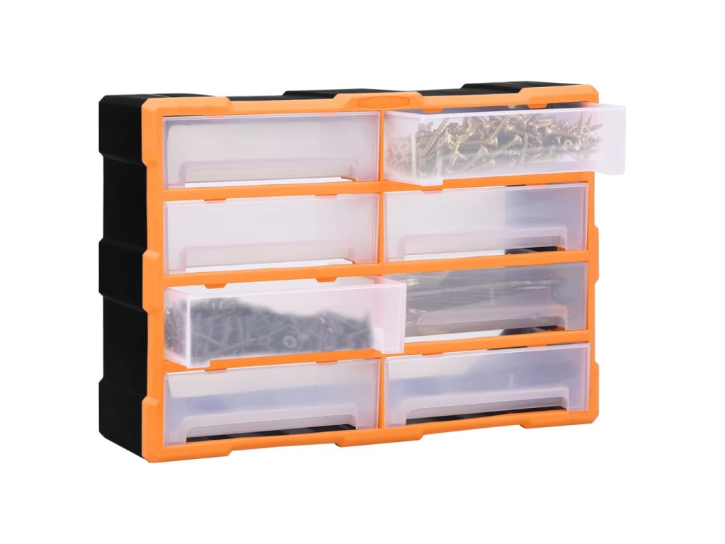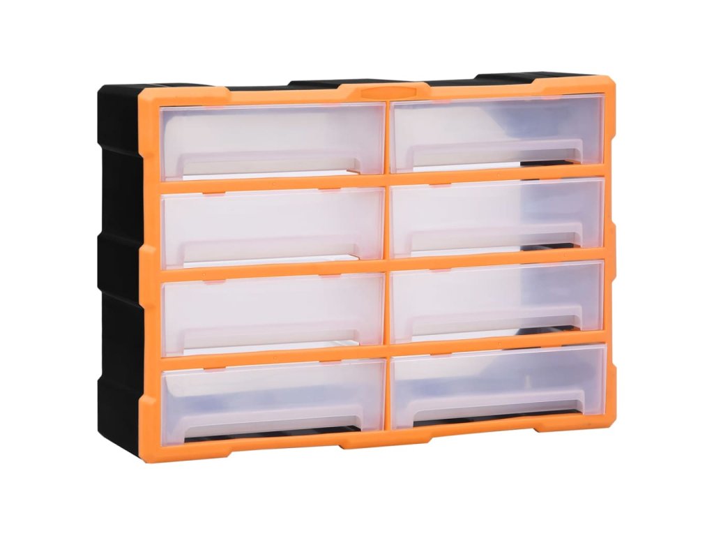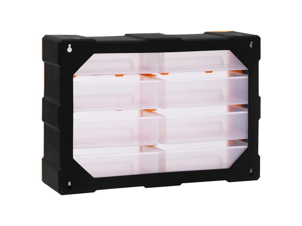 Úložný box obsahuje 8 velkých zásuvek a nabízí spoustu úložného prostoru. Efektivně pomáhá s organizací nářadí a dalšího příslušenství, jako jsou spojovací materiály, takže je budete mít vždy po ruce. Skříňka je vyrobená z nárazuvzdorného plastu, je tedy jak odolná, tak stabilní. Zásuvky z průhledného plastu umožňují snadno a rychle rozpoznat obsah. Box se skvěle hodí k ukládání matic, šroubů, hřebíků a dalších spojovacích prvků a příslušenství obecně.