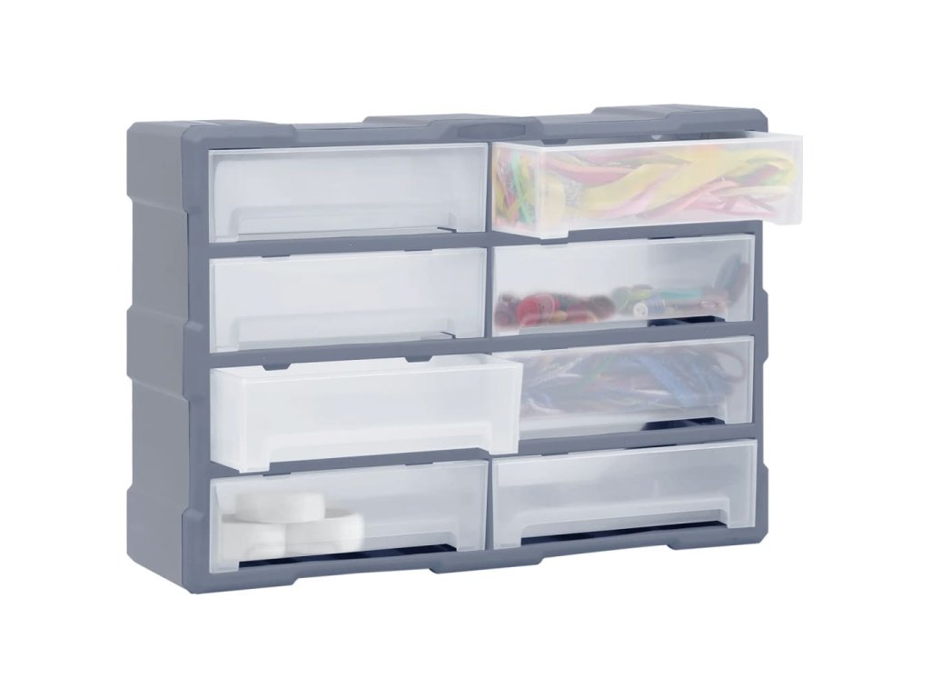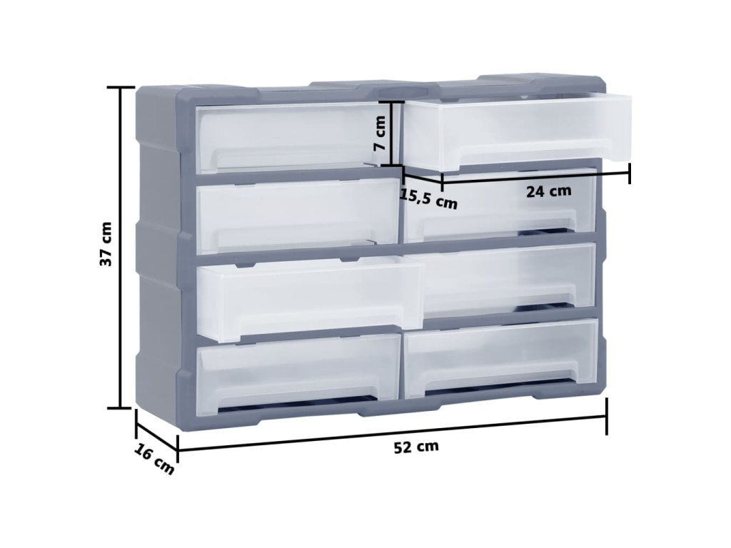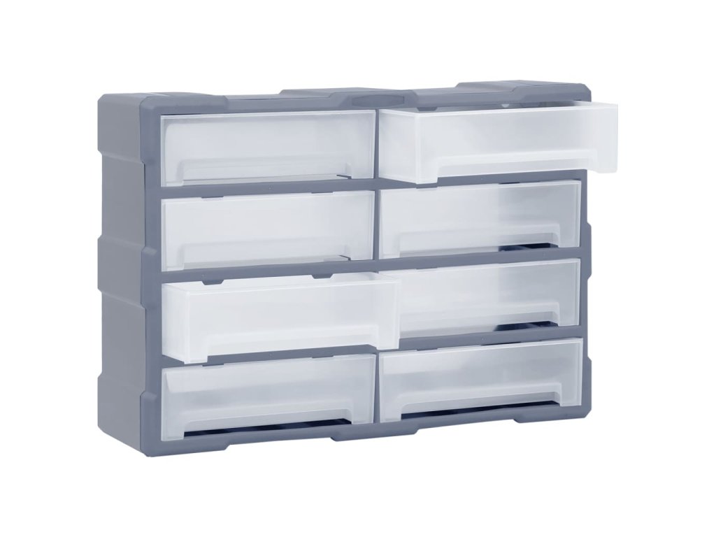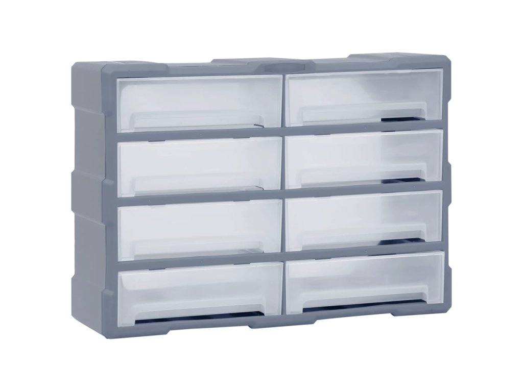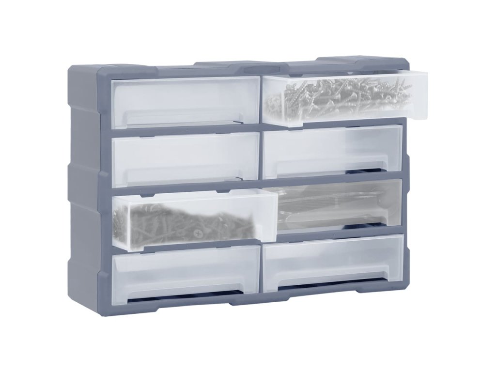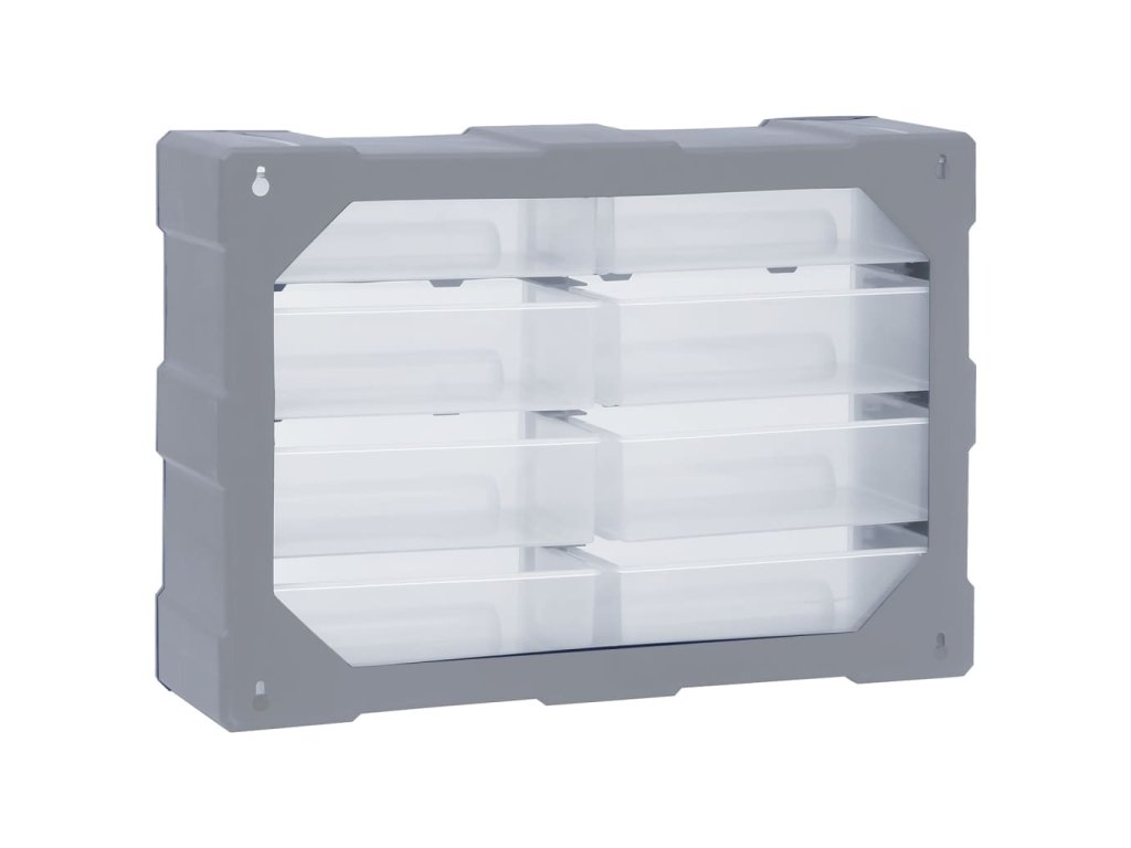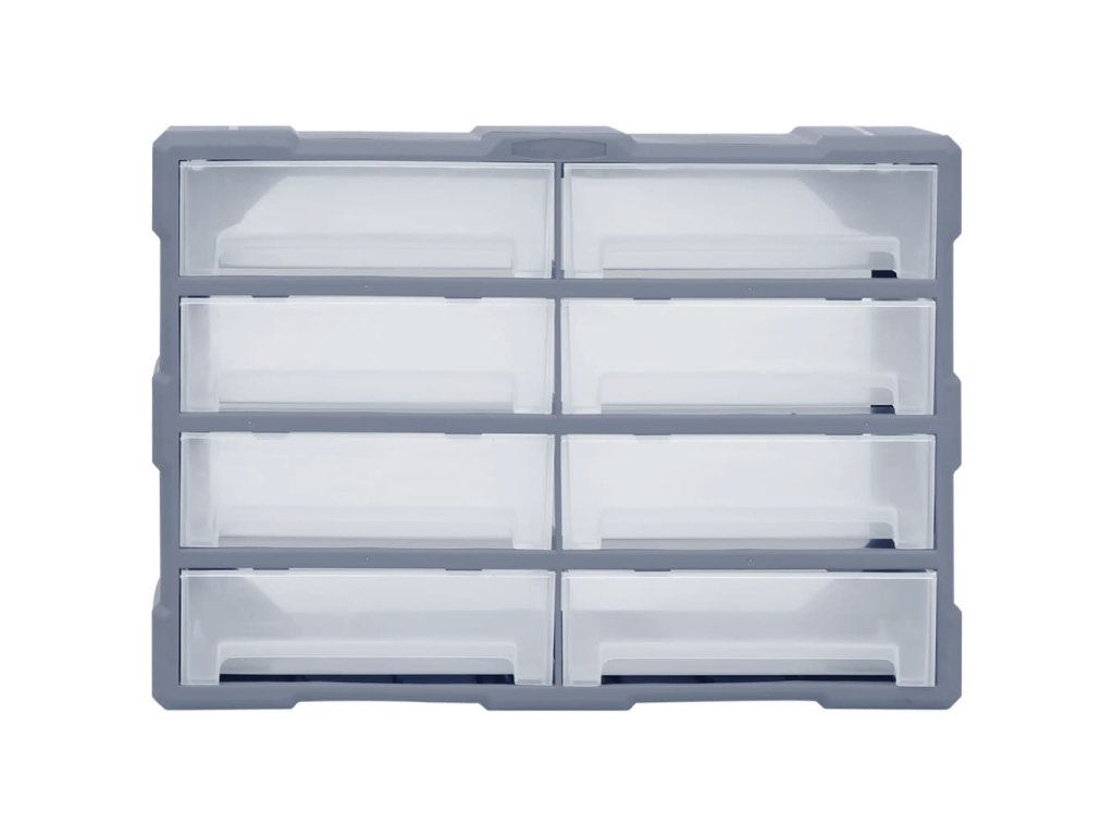Úložný box obsahuje 8 velkých zásuvek a nabízí spoustu úložného prostoru. Efektivně pomáhá s organizací nářadí a dalšího příslušenství, jako jsou spojovací materiály, takže je budete mít vždy po ruce. Skříňka je vyrobená z nárazuvzdorného plastu, je tedy jak odolná, tak stabilní. Zásuvky z průhledného plastu umožňují snadno a rychle rozpoznat obsah. Box se skvěle hodí k ukládání matic, šroubů, hřebíků a dalších spojovacích prvků a příslušenství obecně.