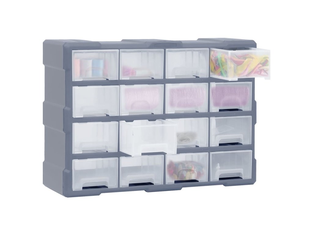 Tento nepostradatelný organizér obsahuje celkem 16 středně velkých zásuvek a je určený k přehlednému skladování celé řady věcí. Můžete ho použít i jako box na šití nebo na nehtovou kosmetiku.