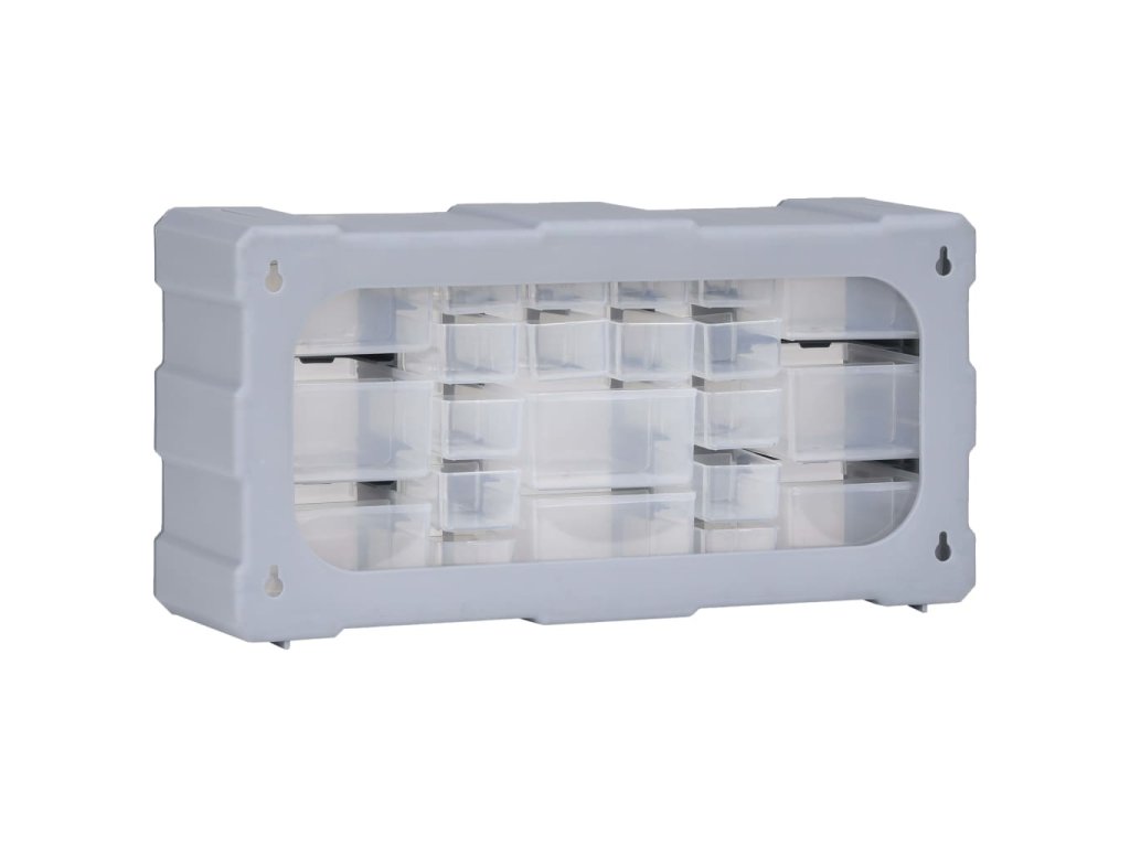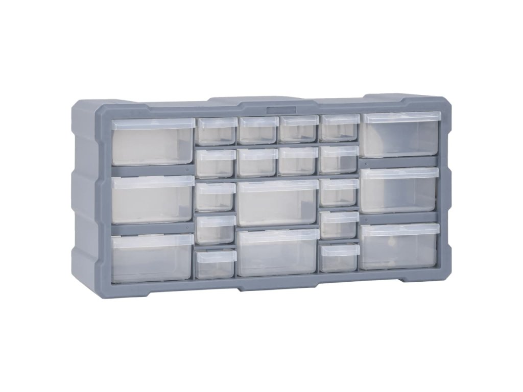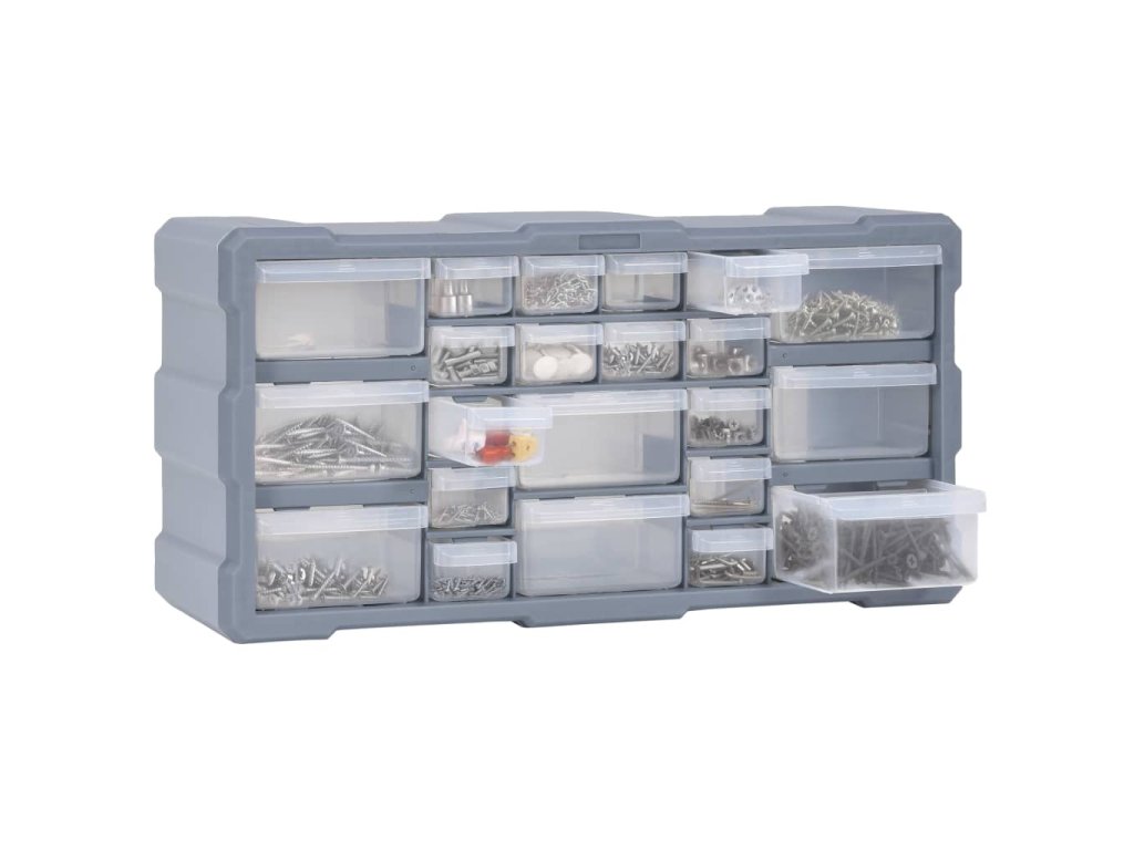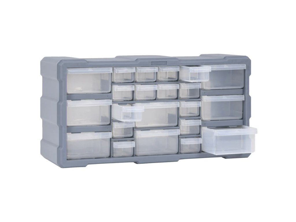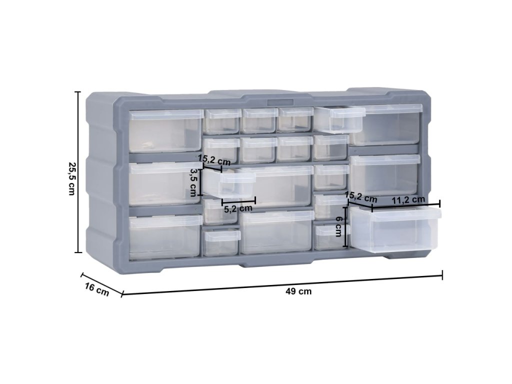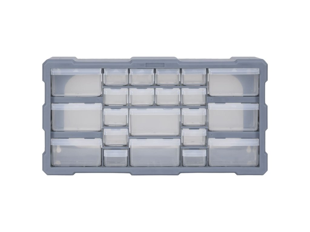 Úložný box obsahuje 14 malých zásuvek a 8 středních zásuvek, aby vyhověl vašim nejrůznějším potřebám. Pomůže vám přehledně si uspořádat nářadí a další příslušenství, jako jsou upevňovací materiály, které budete mít nyní vždy po ruce. Skříňka je vyrobená z nárazuvzdorného plastu, je tedy jak odolná, tak stabilní. Zásuvky z průhledného plastu umožňují snadné a rychlé rozpoznání obsahu. Box se skvěle hodí k ukládání matic, šroubů, hřebíků a dalších upevňovacích dílů a příslušenství obecně.