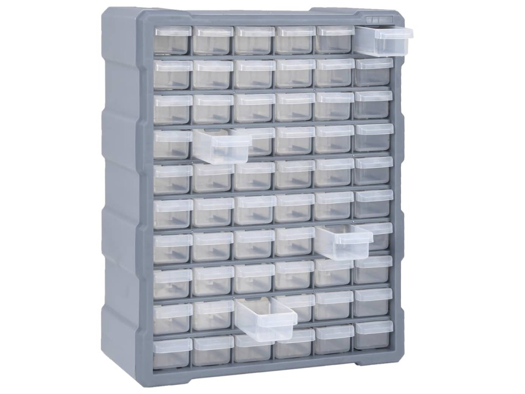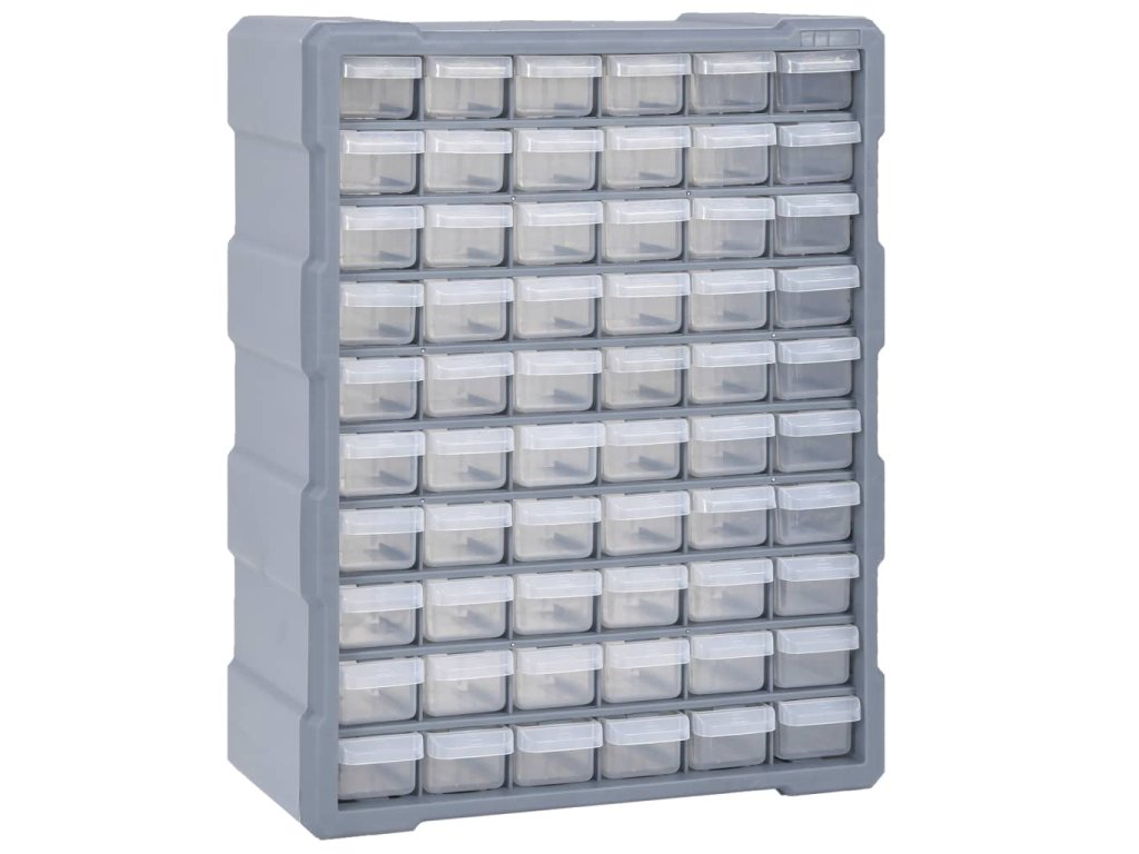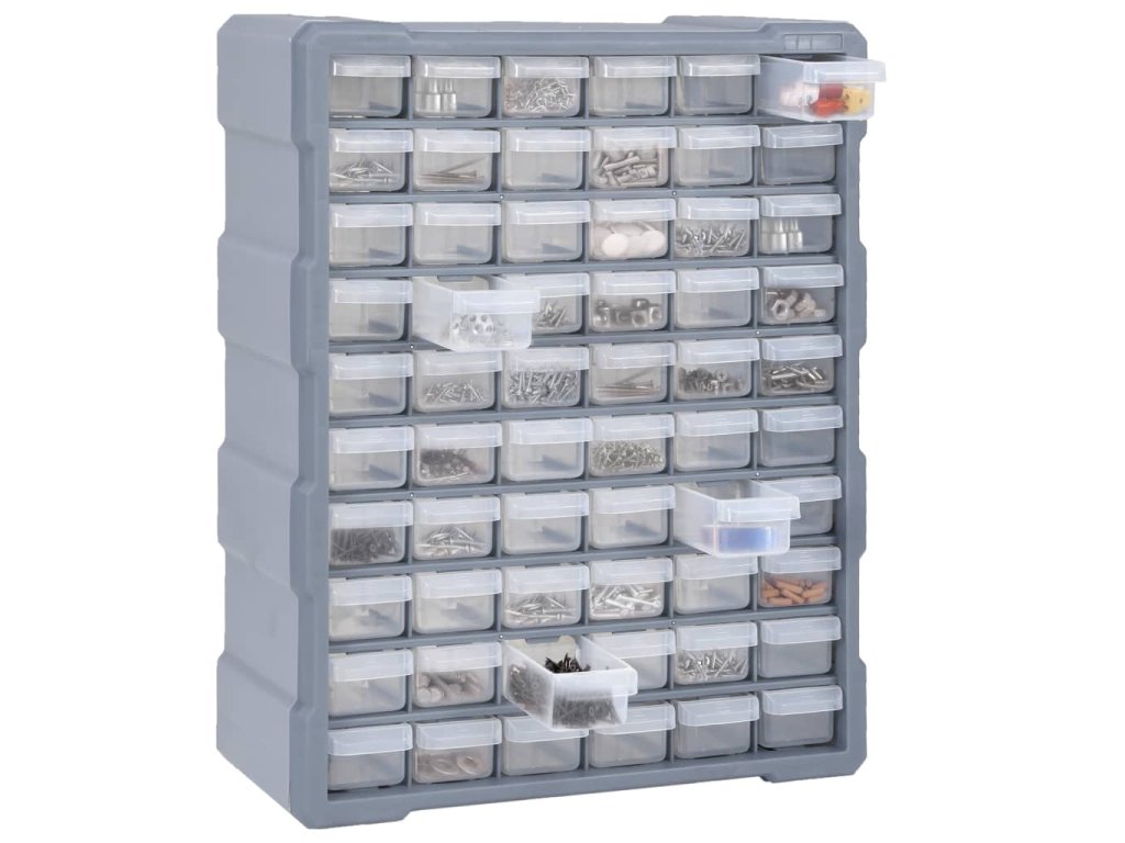 Úložný box obsahuje 60 malých zásuvek a pomůže vám přehledně si uspořádat své nářadí a další příslušenství, jako jsou upevňovací materiály, které budete mít nyní vždy po ruce. Skříňka je vyrobená z nárazuvzdorného plastu, je tedy jak odolná, tak stabilní. Zásuvky z průhledného plastu umožňují snadné a rychlé rozpoznání obsahu. Box se skvěle hodí k ukládání matic, šroubů, hřebíků a dalších upevňovacích dílů a příslušenství obecně.