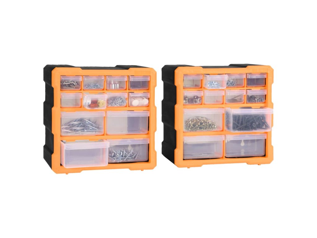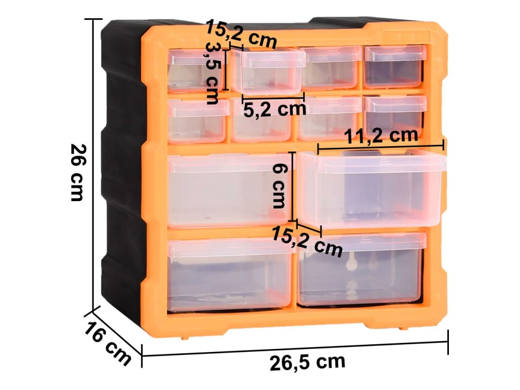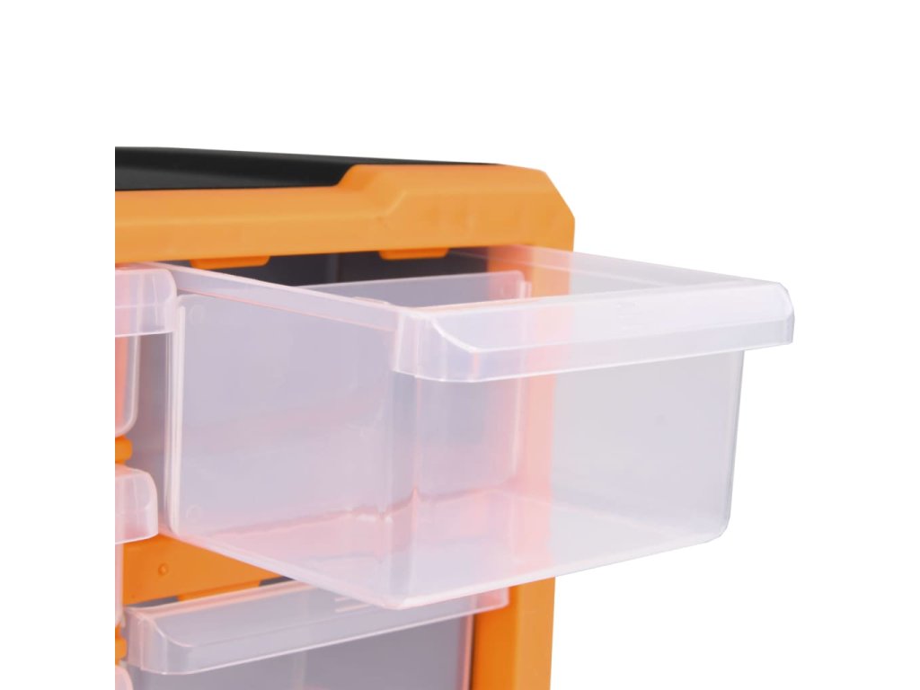 Každý úložný box obsahuje 8 malých zásuvek a 4 střední zásuvky, aby vyhověl vašim nejrůznějším potřebám. Pomůže vám přehledně si uspořádat své nářadí a další příslušenství, jako jsou upevňovací materiály, které budete mít nyní vždy po ruce. Skříňka je vyrobená z nárazuvzdorného plastu, je tedy jak odolná, tak stabilní. Zásuvky z průhledného plastu umožňují snadné a rychlé rozpoznání obsahu. Box se skvěle hodí k ukládání matic, šroubů, hřebíků a dalších upevňovacích dílů a příslušenství obecně.