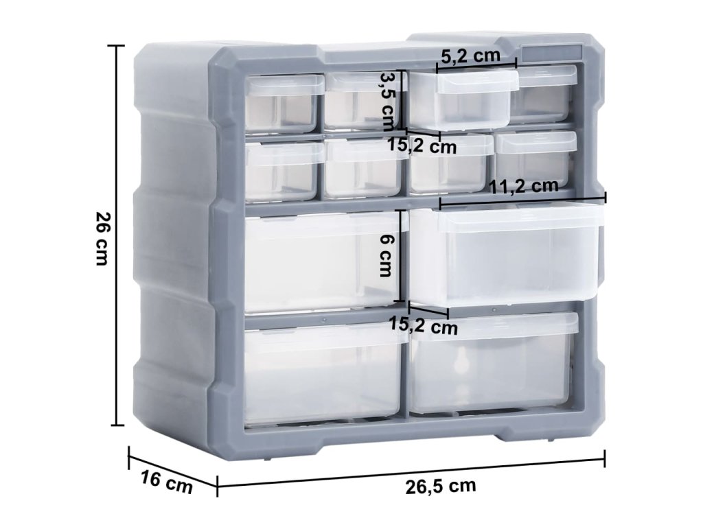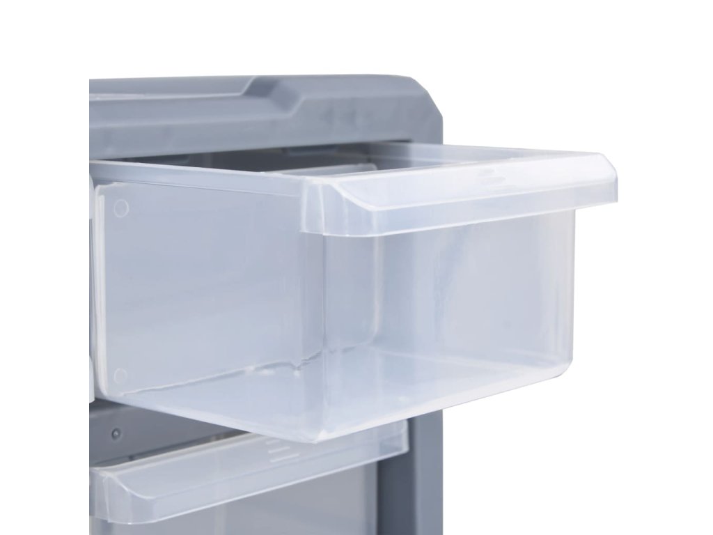 Každý úložný box obsahuje 8 malých zásuvek a 4 střední zásuvky, aby vyhověl vašim nejrůznějším potřebám. Pomůže vám přehledně si uspořádat své nářadí a další příslušenství, jako jsou upevňovací materiály, které budete mít nyní vždy po ruce. Skříňka je vyrobená z nárazuvzdorného plastu, je tedy jak odolná, tak stabilní. Zásuvky z průhledného plastu umožňují snadné a rychlé rozpoznání obsahu. Box se skvěle hodí k ukládání matic, šroubů, hřebíků a dalších upevňovacích dílů a příslušenství obecně.
