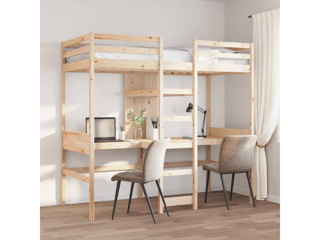 Tato všestranná patrová postel kombinuje jednolůžko s psacími stoly a policemi, takže poskytuje útulný prostor na spaní, prostornou pracovní plochu a šikovné úložné řešení. Je ideální volbou pro domácnosti s omezeným prostorem.