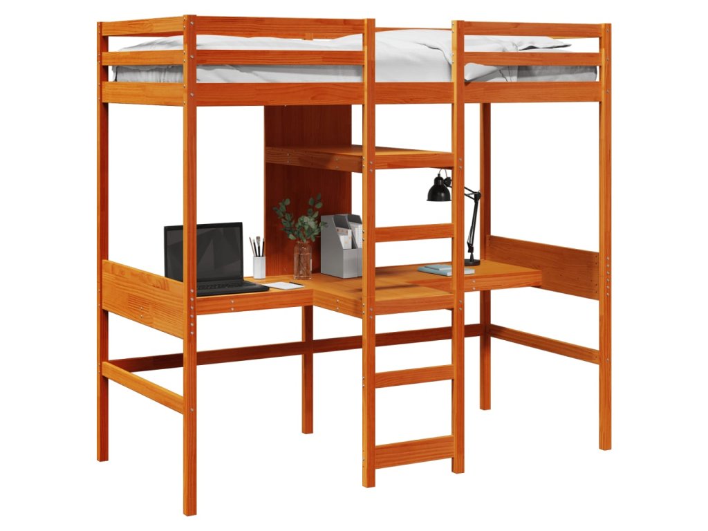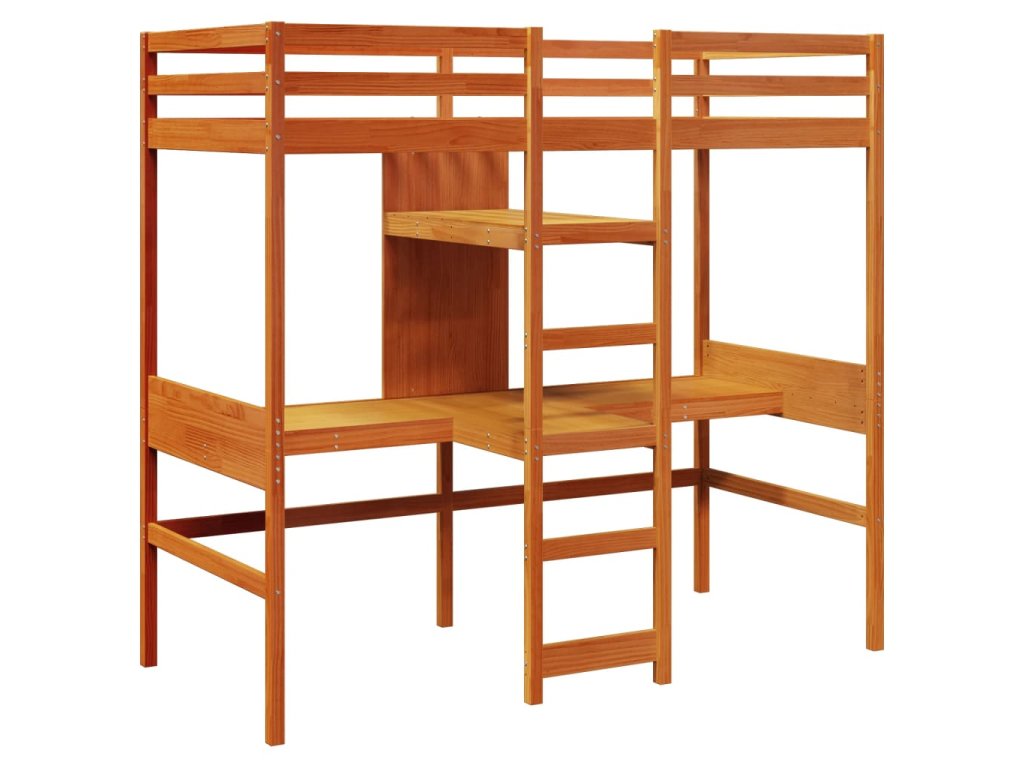 Tato všestranná patrová postel kombinuje jednolůžko s psacími stoly a policemi, takže poskytuje útulný prostor na spaní, prostornou pracovní plochu a šikovné úložné řešení. Je ideální volbou pro domácnosti s omezeným prostorem.