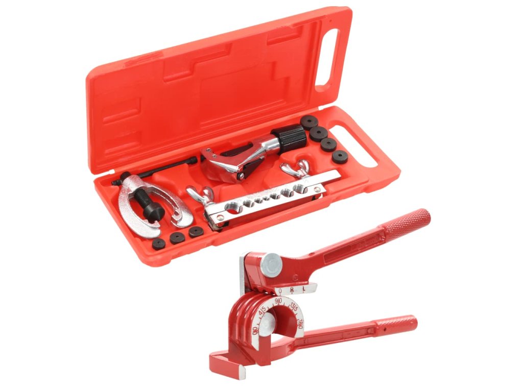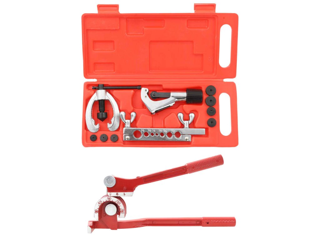 Tato vysoce kvalitní pertlovací souprava s ohýbačkou může být použita pro jednoduché nebo dvojité pertlování na mědi, mosazi a hliníkových trubikách, atd Kalená ocel s chromovou úpravou zaručuje pevnost a trvanlivost. Sada je dodávána v pevném červeném kufříku pro snadné uložení a přepravu. Kompletní výrobek obsahuje: 1 x pertlovací nastroj, 1 x Pertl, 1x řezák trubek, 7x pertovací adaptér, 1x ohýbačka, 1x plastový kufřík Ohýbačka trubek je ideální pro ohýbání brzdových a palivových trubek a je také ideální pro použití v garážích, dílnách, pro kovářé , instalatéry, inženýry, lehké železné práce, atd, přesně ohýbání: 6/8 / 10mm trubky, z 0 až 180 stupňů. Řezák trubek vhodný pro měď, mosaz, hliník, plastové trubky a tenkostěnné potrubí. Řezná kapacita je od 1/8 "- 11/8". Vylepšený nástroj pro trubky ( 42 HRC) mohou stlačit 7 typů trubek : : 3/16 ", 1/4", 5/16 ", 3/8", 7/16 ", 5/8", 1/2 ", rozměry jsou stejné jako u 7. zahrnuty dvojité pertlovacie adaptéry. Poznámka: Dodávka obsahuje červený kufřík, který obsahuje celou pertlovací soupravu, a červenou ohýbačku, která je individuálně zabalena v krabičky.