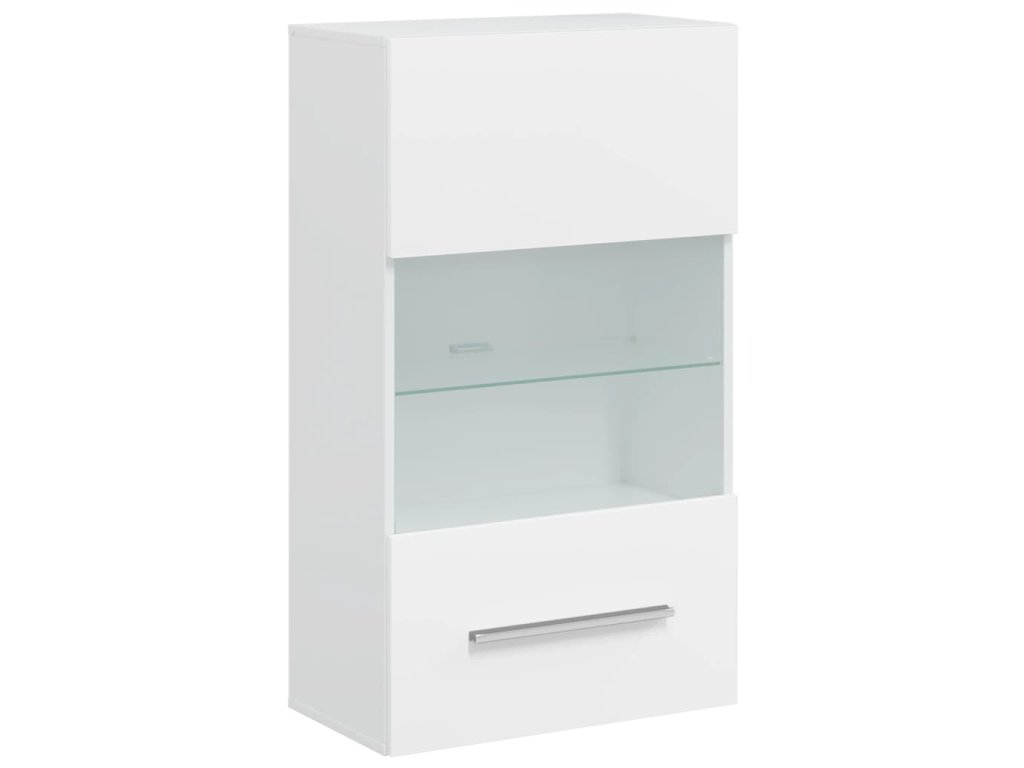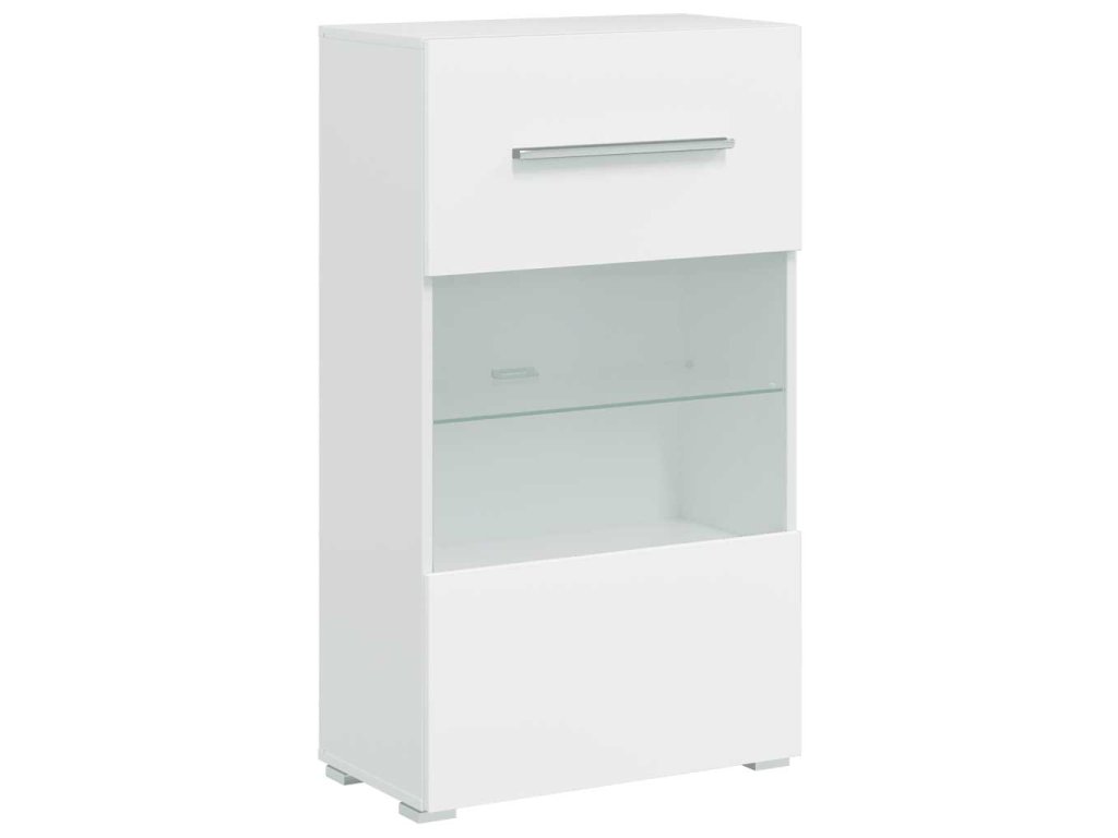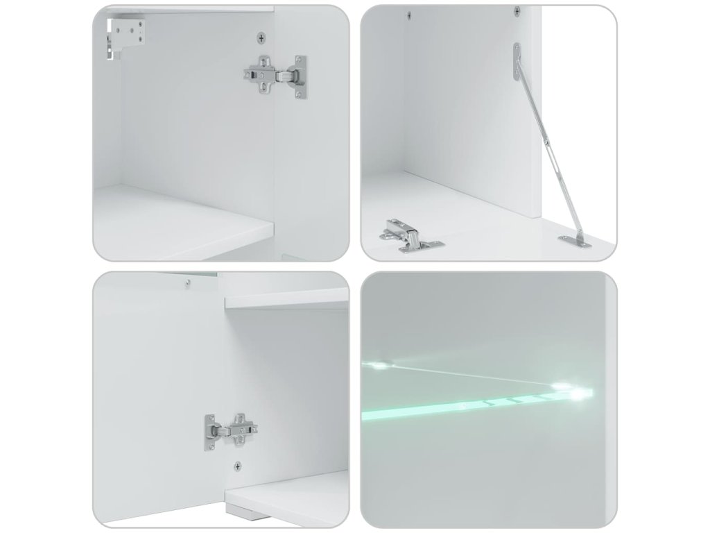 Sada, skládající se z nástěnné skříňky, samostatně stojící skříňky, dvou skříněk pod TV a nástěnné police, poskytuje dostatek prostoru pro ukládání multimediálních zařízení, knih a všech menších předmětů. Bude také ideální pro vystavení dekorativních předmětů, fotorámečků nebo dokonce i hrnkových rostlin. TV stolky s vyklápěcími dvířky poskytují dostatek místa, aby vaše knihy, různé potřeby, DVD přehrávač, nosiče médií atd. byly dobře uspořádané. Nástěnná skříňka a stojací skříňka jsou vybaveny jedněmi částečně prosklenými dvířky a třemi policemi, včetně jedné skleněné police s energeticky úsporným bílým LED osvětlením.