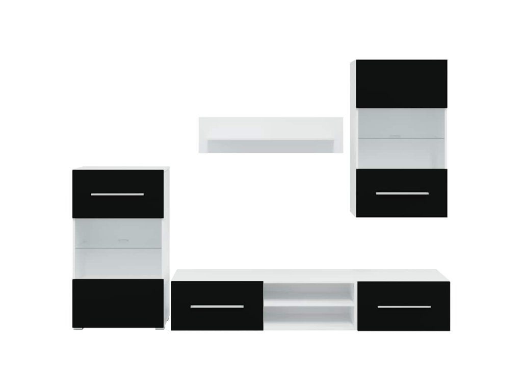 Sada, skládající se z nástěnné skříňky, samostatně stojící skříňky, dvou skříněk pod TV a nástěnné police, poskytuje dostatek prostoru pro ukládání multimediálních zařízení, knih a všech menších předmětů. Bude také ideální pro vystavení dekorativních předmětů, fotorámečků nebo dokonce i hrnkových rostlin. TV stolky s vyklápěcími dvířky poskytují dostatek místa, aby vaše knihy, různé potřeby, DVD přehrávač, nosiče médií atd. byly dobře uspořádané. Nástěnná skříňka a stojací skříňka jsou vybaveny jedněmi částečně prosklenými dvířky a třemi policemi, včetně jedné skleněné police s energeticky úsporným bílým LED osvětlením.