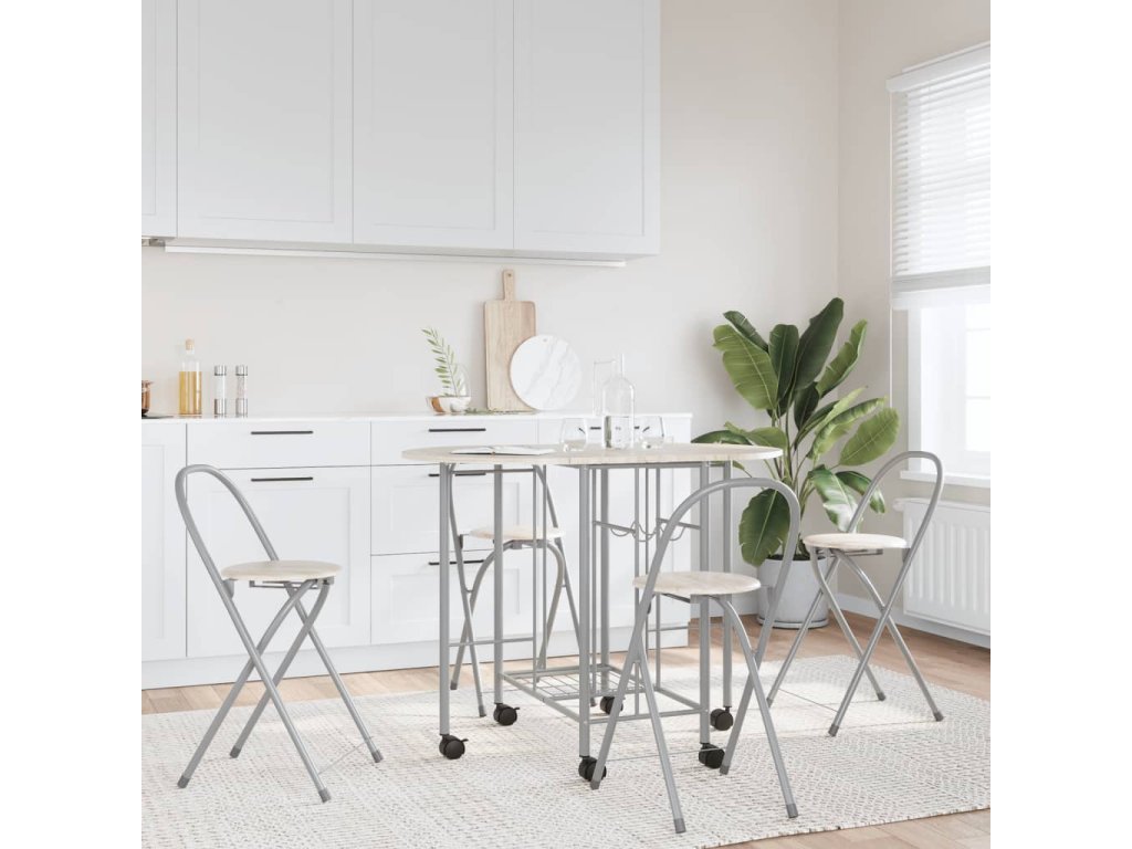 Železné rámy s práškovým nástřikem činí stůl a židle silnými a robustními a díky lehké konstrukci se všemi součástmi snadno pohybuje. Tento jídelní set, vyrobený z vysoce kvalitního MDF, je odolný a snadno se čistí. Díky skládací konstrukci mohou být židle uloženy pod skládací stůl, abyste ušetřili úložný prostor, když set nepoužíváte, takže je sada ideální pro menší kuchyně a jídelny.