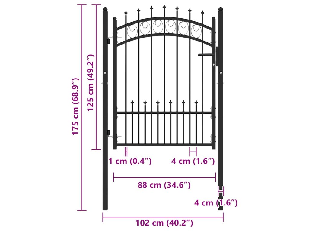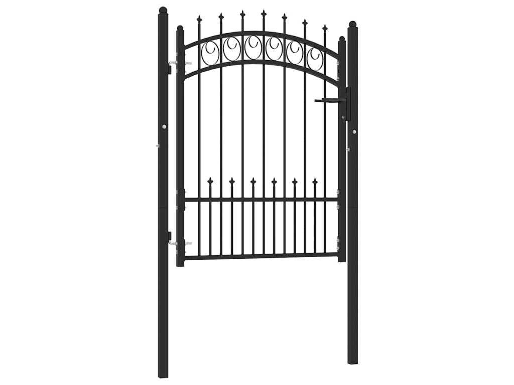 Plotová branka je vyrobená z vysoce odolné oceli, má robustní konstrukci s práškovým nástřikem proti rzi a korozi. Zahradní branka je vybavená vertikálním pruty zakončenými hroty a silnou vodorovnou výztuží, takže vám poskytne vysoký stupeň zabezpečení. Klenutý design jí dodává na eleganci. Součástí balení jsou dva pevné sloupky s robustními závěsy pro snadnou instalaci a také zámek se třemi klíči.