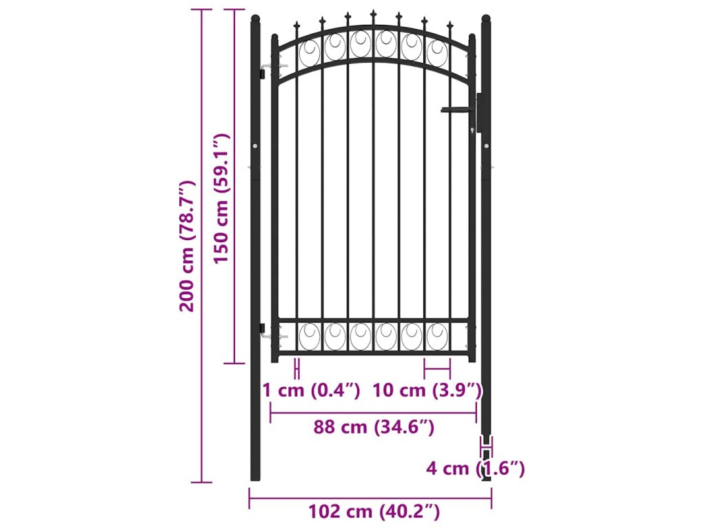 Plotová branka je vyrobená z vysoce odolné oceli, má robustní konstrukci s práškovým nástřikem proti rzi a korozi. Zahradní branka je vybavená vertikálním pruty zakončenými hroty a silnou vodorovnou výztuží, takže vám poskytne vysoký stupeň zabezpečení. Klenutý design jí dodává na eleganci. Součástí balení jsou dva pevné sloupky s robustními závěsy pro snadnou instalaci a také zámek se třemi klíči.