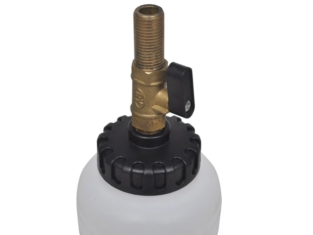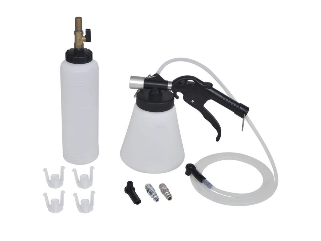 Jedno osobní odsávání brzdového oleje je snadné pomocí tohoto ručního 1L stroje spolu s přiloženým 0,7l kontejnerem pro nový olej. Použití přívodu vzduchu pro standardní dílny (6-12 bar), souprava funguje účinně pro vyprázdnění a naplnění brzdového systému na většině automobilů. Nástroj stahuje olej přes odvzdušňovací šroub. Hadice pro olej jsou také v ceně. Tento seznam je pro sadu na odsávání brzdového oleje a spojky s hadicí, lahvička tekutin, 2 kovové konektory a dalších 4 konektorů.