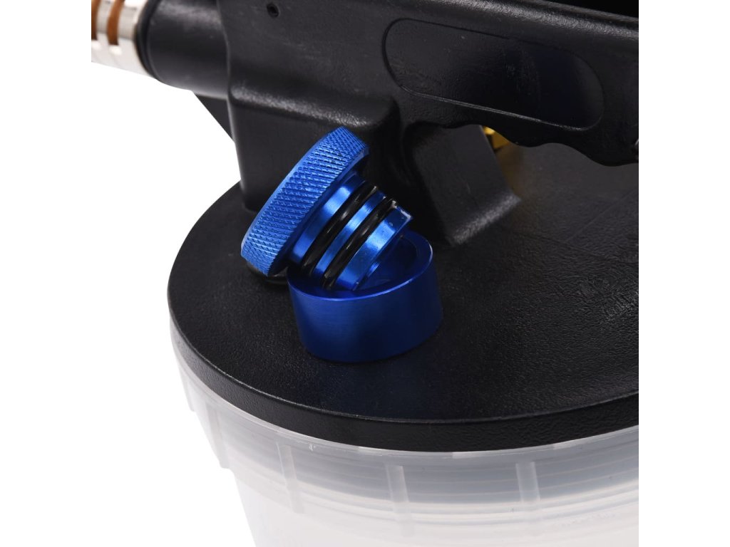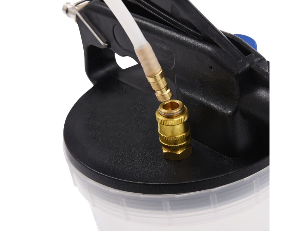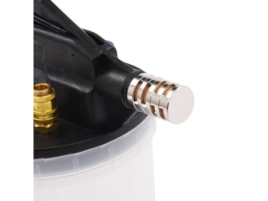 Odvzdušňovač brzd je vyrobený z odolného korozivzdorného plastu a velmi snadno se čistí. Obsahuje jistící ventil a bezpečnostní kalíšek pro automatické zastavení vypouštění. Starý olej sbírá bez rozlití. Zpětný ventil zabraňuje zpětnému toku při vypouštění a háček zajišťuje průchod vzduchu pro plynulé vypouštění oleje.