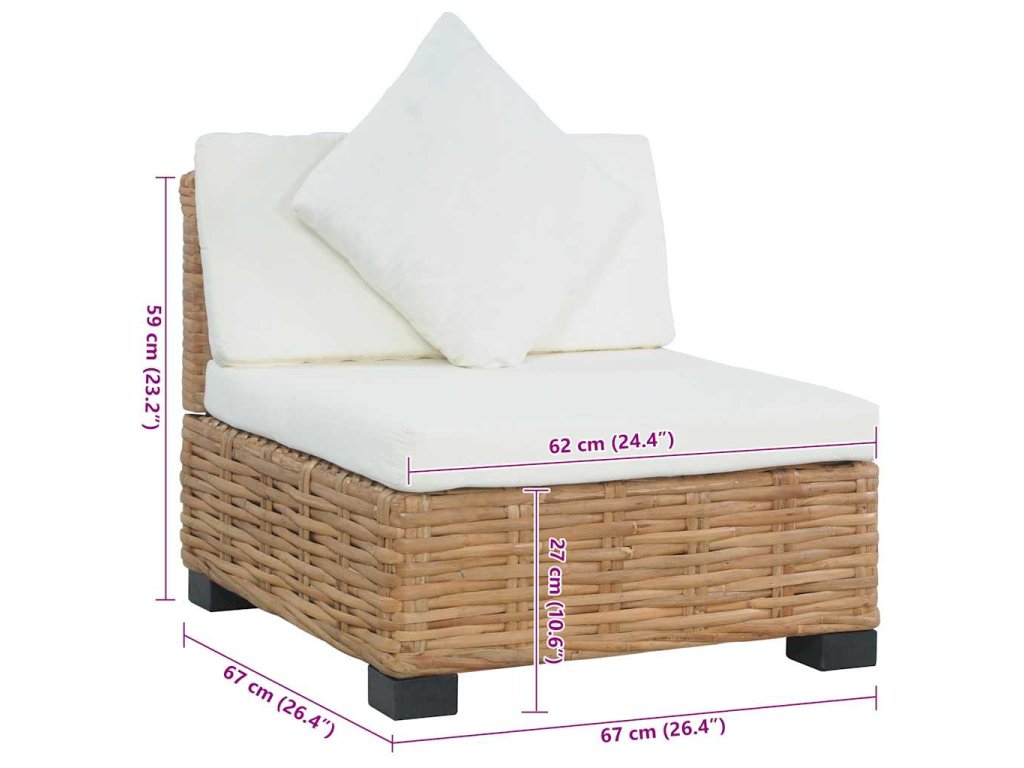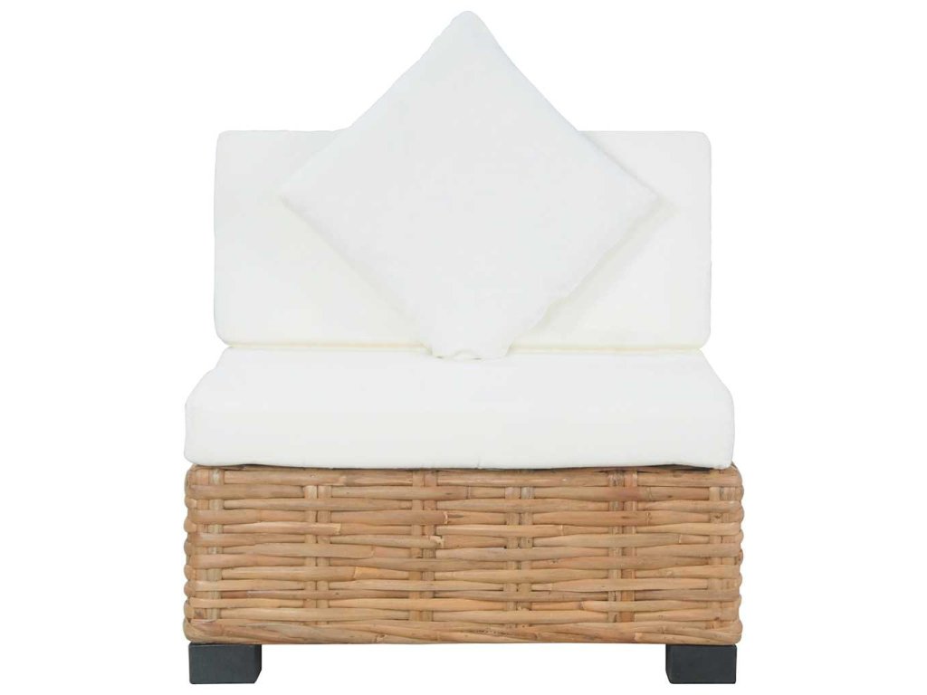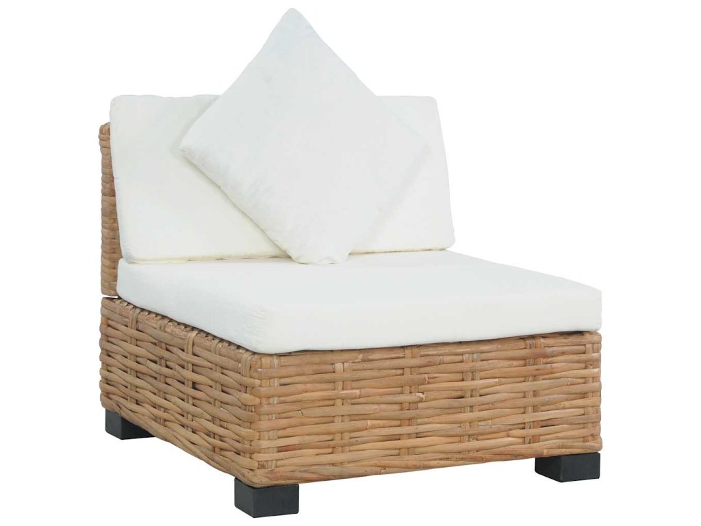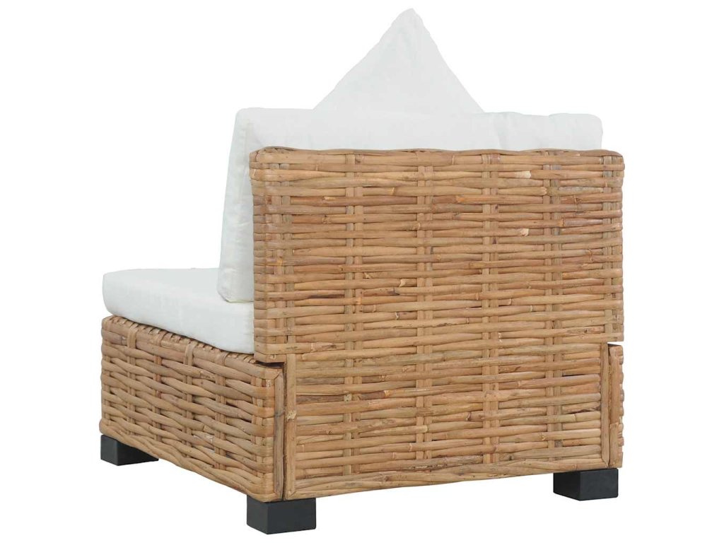 Tato pohovka je pokrytá přírodním ratanem, který nejenže dobře vypadá, ale je také velmi odolný. Ratan má líbivý přirozený vzhled a je příjemný na dotek. Nohy pohovky jsou vyrobené z mahagonového a mangovníkového dřeva, velmi tvrdého a stabilního materiálu. Pohodlné podušky poskytují komfort a vytváří útulnou atmosféru. Sestavení pohovky bez područek je snadné. Součástí balení je 1 pohovka bez područek, 1 poduška na sedák, 1 poduška pod záda a 1 polštář.