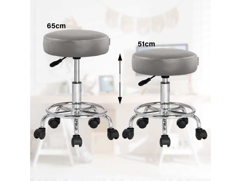 Stylová a praktická otočná pracovní stolička v elegantní šedé barvě je ideální volbou pro dílnu, kancelář, kosmetický salón nebo domácí pracovnu. Nabízí plně otočný sedák (360°), plynulé nastavení výšky od 51 do 65 cm a mimořádné pohodlí díky měkkému 10cm polstrování.