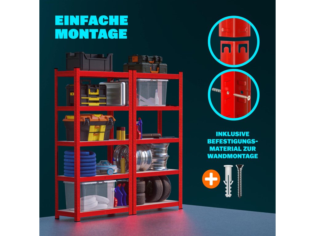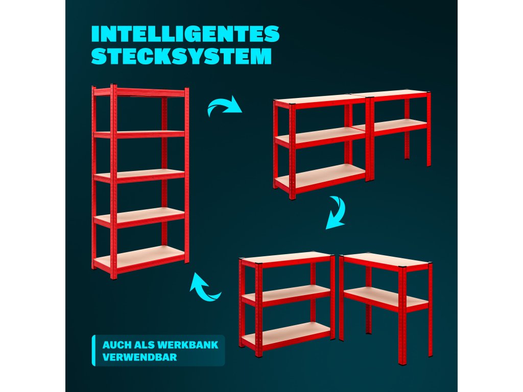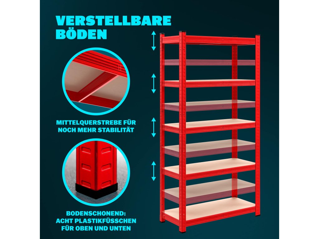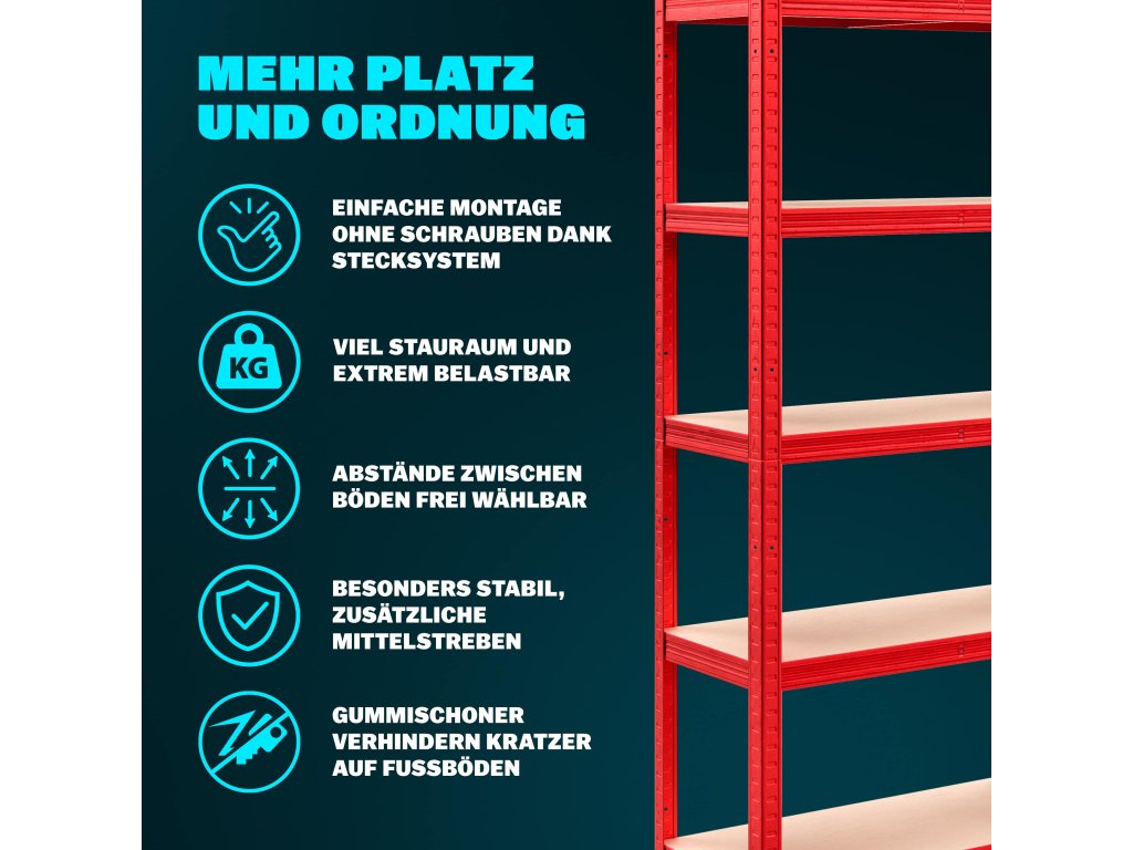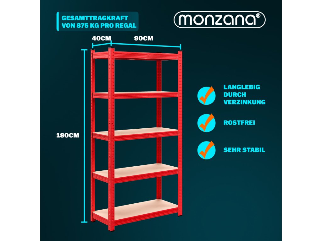 Kovový regál MONZANA® 180 cm, 5 polic, MDF výplně, až 875 kg nosnost, bezšroubové spojení, červené provedení