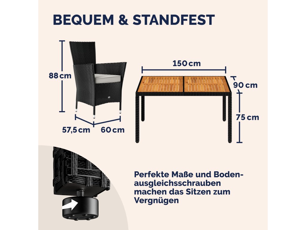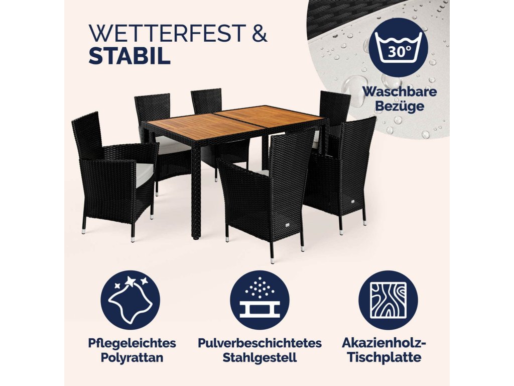 Zahradní sedací souprava CASARIA® Korfu, 7dílná, pro 6 osob, polyratan, akáciové dřevo, černá/krémová