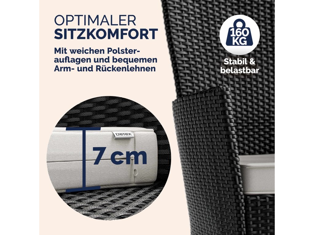 Židle mají široká opěradla a ergonomicky tvarované područky, což zaručuje pohodlné sezení i při delším posezení. Součástí jsou také 7 cm silné podušky, jejichž snímatelné potahy můžete vyprat při 30 °C. Stabilní ocelová konstrukce s práškovým nástřikem zajišťuje dlouhou životnost a nosnost až 160 kg na každou židli.
