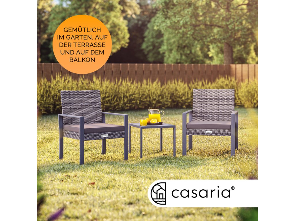 Užijte si letní relax naplno s elegantní 3dílnou zahradní sestavou CASARIA® v šedém provedení. Stylová kombinace polyratanového výpletu, ocelové konstrukce a stolní desky z WPC materiálu (dřevo-plastový kompozit) v přírodní optice nabízí nejen moderní vzhled, ale i vysokou odolnost vůči počasí a snadnou údržbu.