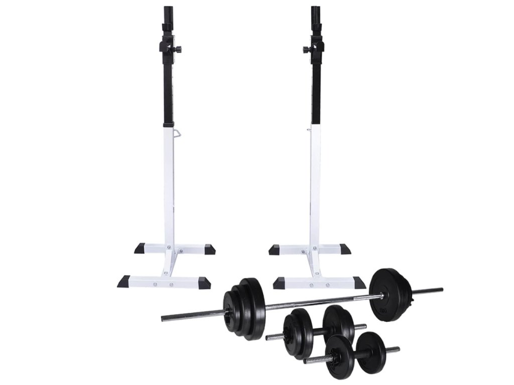 Tento vysoce odolný činkový/posilovací stojan se sadou činek je ideální na dřepy a bench press trénink ve vaší domácí tělocvičně.
