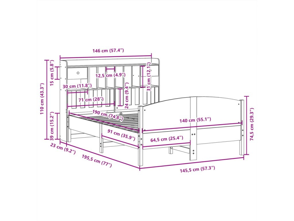 Postel s knihovnou bez matrace 140 x 190 cm masivní borovice 3323151