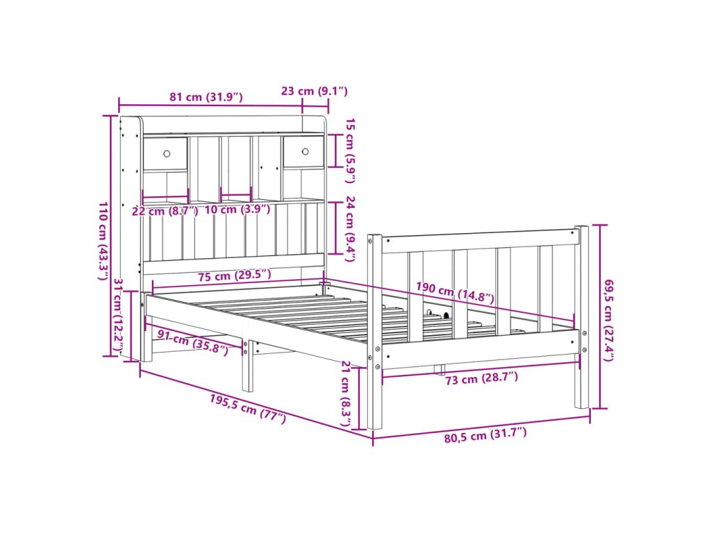 Postel s knihovnou bez matrace hnědá 75x190 cm masivní borovice 3321753