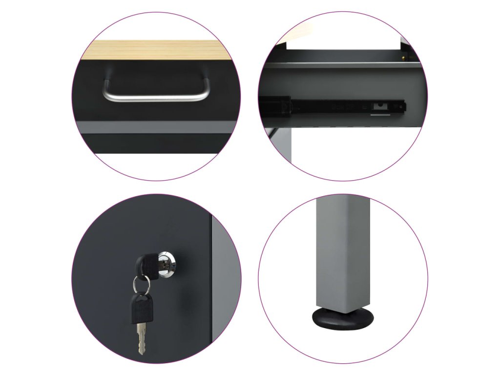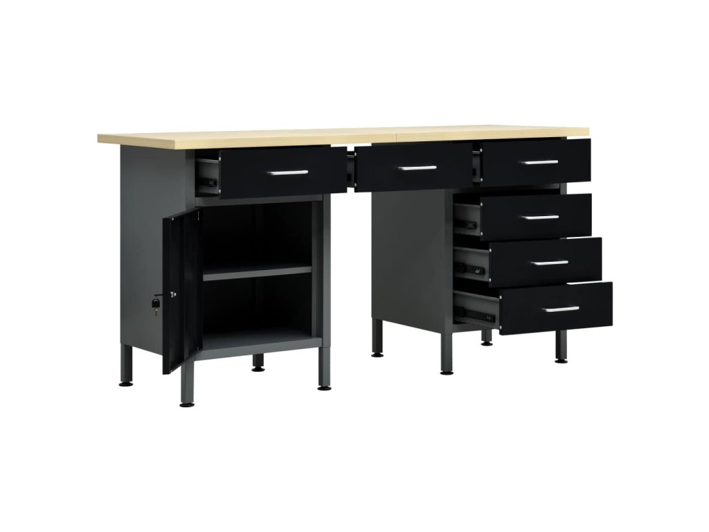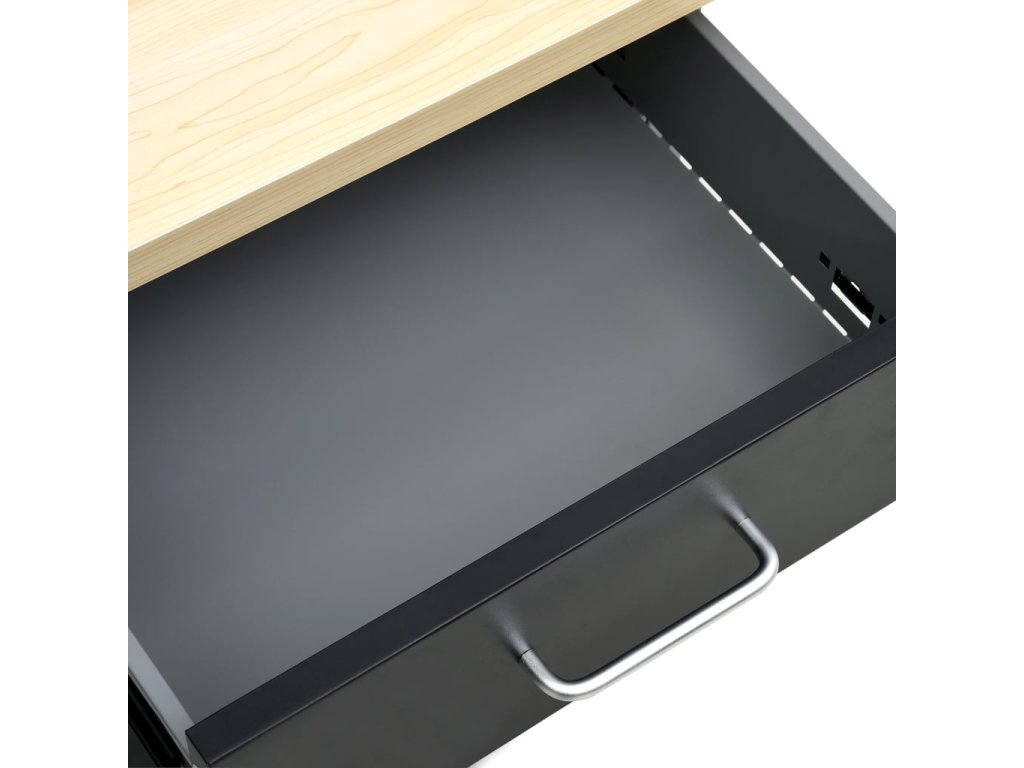 Prostorná a robustní stolní deska je stabilní platforma pro všechny vaše opravářské práce. Pracovní stůl má 6 zásuvek, kam si můžete dobře uspořádat nářadí, díly a příslušenství, jako jsou šrouby, hřebíky a lepicí pásky. Všechny zásuvky jsou vybavené mechanismem s kuličkovými ložisky pro hladké klouzání. K dispozici je také vhodný prostor pro větší nástroje, který najdete ve skříňce s uzamykatelnými dvířky. Snadno a bezpečně si sem uložíte vrtačky, kabely a brusky.