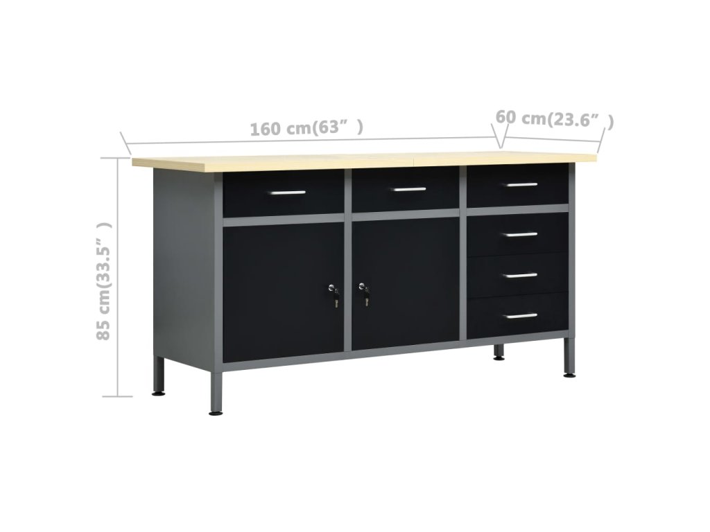 Velmi odolný pracovní stůl s velkým úložným prostorem má nosnost 500 kg. Jeho prostorná a odolná stolní deska je stabilní plocha pro všechny vaše pracovní činnosti. Tento pracovní stůl má 6 zásuvek, kam si můžete dobře uspořádat své nářadí, díly a příslušenství, jako jsou šrouby, hřebíky a lepicí pásky. Všechny zásuvky jsou vybavené kuličkovými pojezdy pro snadné vysouvání a zasouvání. Za uzamykatelnými dvířky jsou 2 police a velká přihrádka pro větší nástroje, jako jsou vrtačky, bubny s kabely a brusky. Výškově nastavitelné nohy vám umožňují přizpůsobit si výšku stolu. Celý ponk je vyrobený z prvotřídní oceli a dřevotřísky, a proto je mimořádně robustní, má dlouhou životnost a snadno se čistí. Jeho sestavení je snadné.