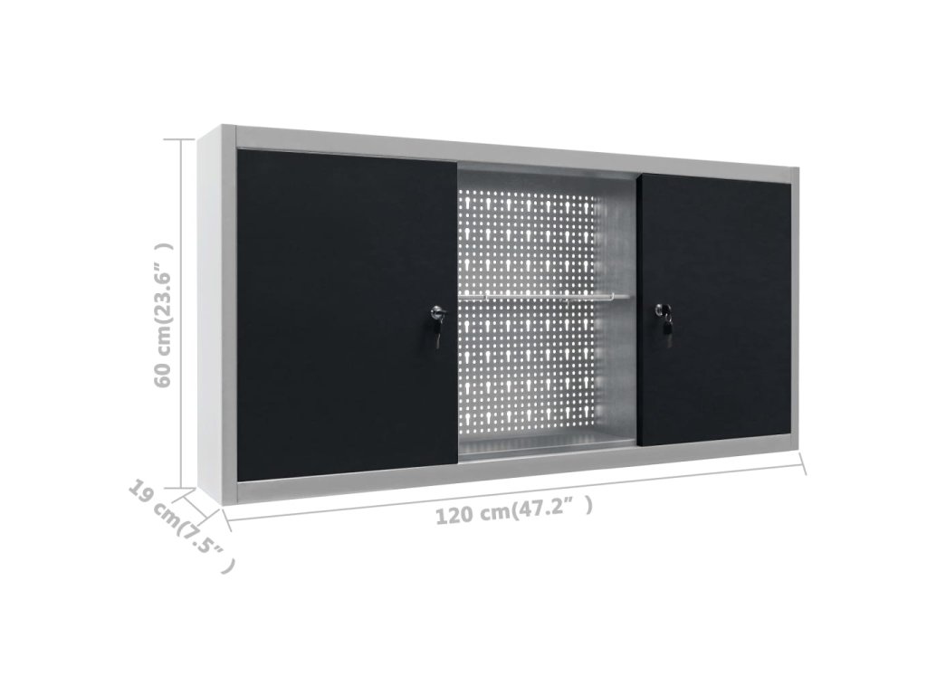 Nástěnné úložné řešení na nářadí je vybavené třemi výškově nastavitelnými policemi a děrovanou deskou s otvory, které lze použít k zavěšení různých druhů nástrojů, jako jsou klíče, kleště, kladiva apod. Obě nástěnné skříňky mají pro větší bezpečnost uzamykatelná dvířka (2 klíče pro každá dvířka). Úložná stěna je vyrobená z kovu s extra silnou vrstvou proti poškrábání, takže má dlouhou životnost a snadno se čistí. Tento produkt je třeba sestavit.