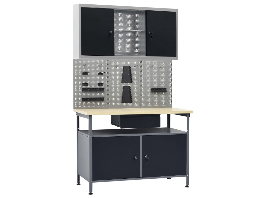 Tato dílenská sada 1 pracovního stolu se 3 nástěnnými panely a 1 nástěnnou skříňkou je praktické úložné řešení pro vaši dílnu a garáž.