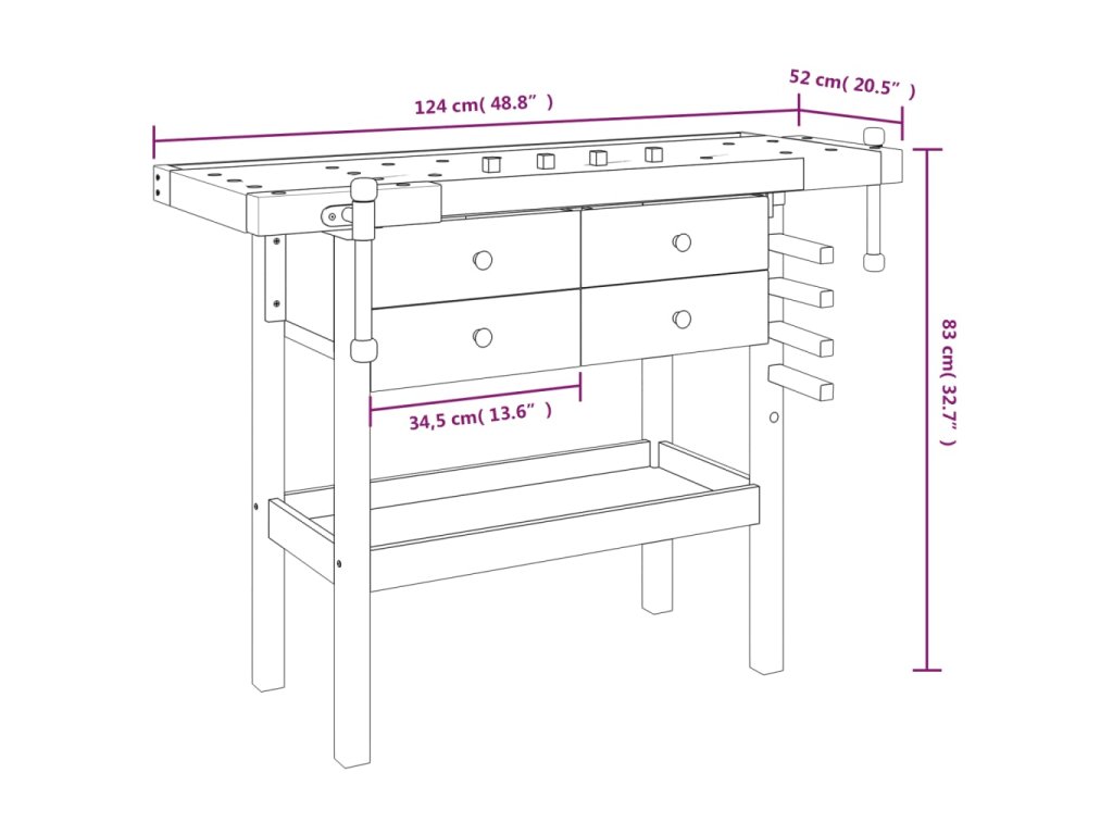 - Dostatek úložného prostoru: Tato pracovní stanice se 4 úložnými zásuvkami a policí poskytuje dostatek úložného prostoru, abyste měli nářadí přehledně uspořádané a po ruce.