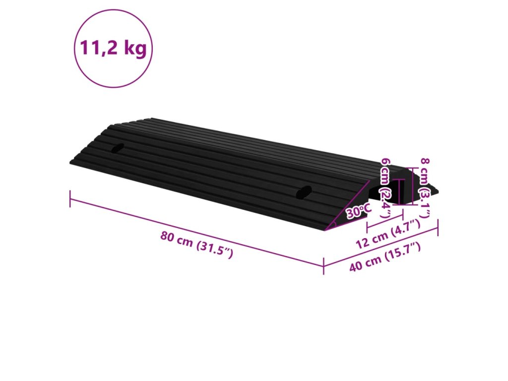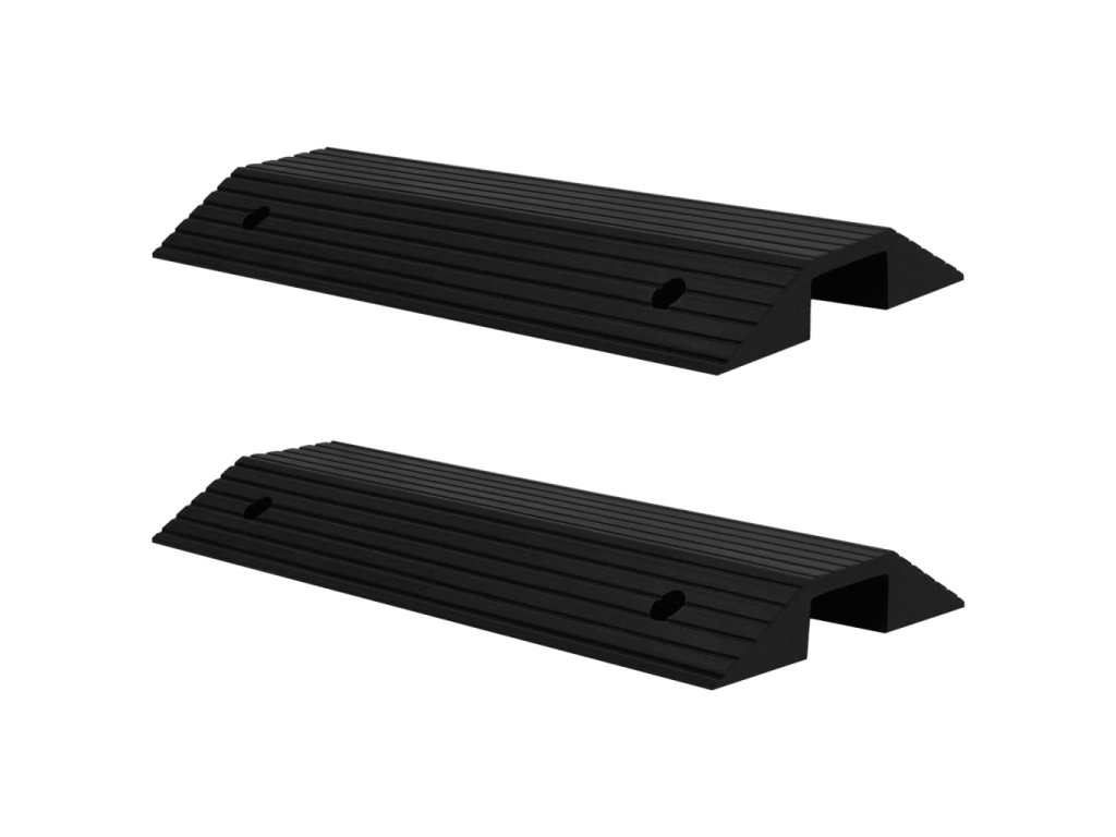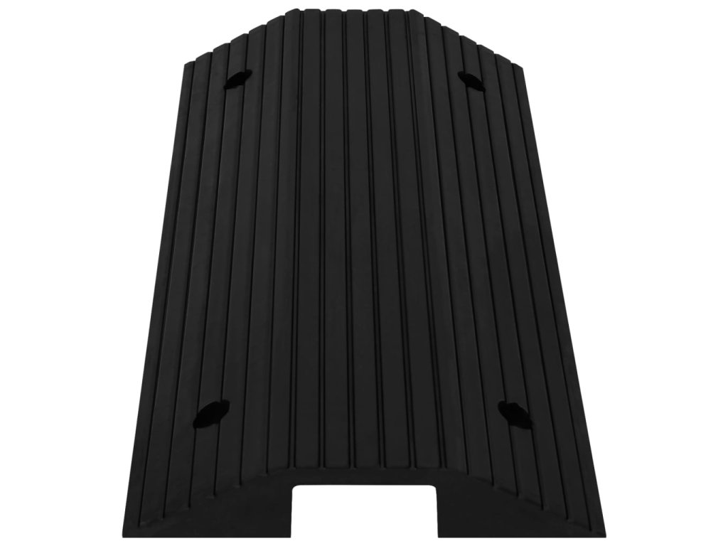 Přejezdová rampa je vyrobena z pevné pryže, je lehká a dostatečně odolná pro dlouhodobé používání. Drsný povrch má protiskluzovou strukturu, která pomáhá zabránit uklouznutí při nájezdu.
