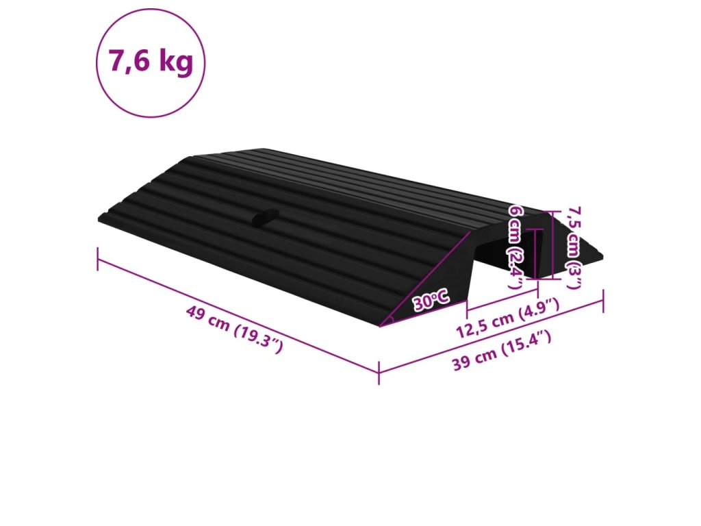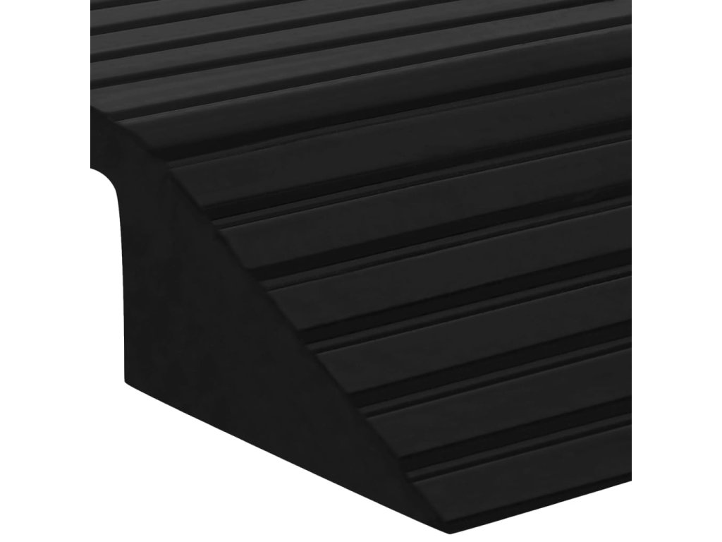 Přejezdová rampa je vyrobena z pevné pryže, je lehká a dostatečně odolná pro dlouhodobé používání. Drsný povrch má protiskluzovou strukturu, která pomáhá zabránit uklouznutí při nájezdu.