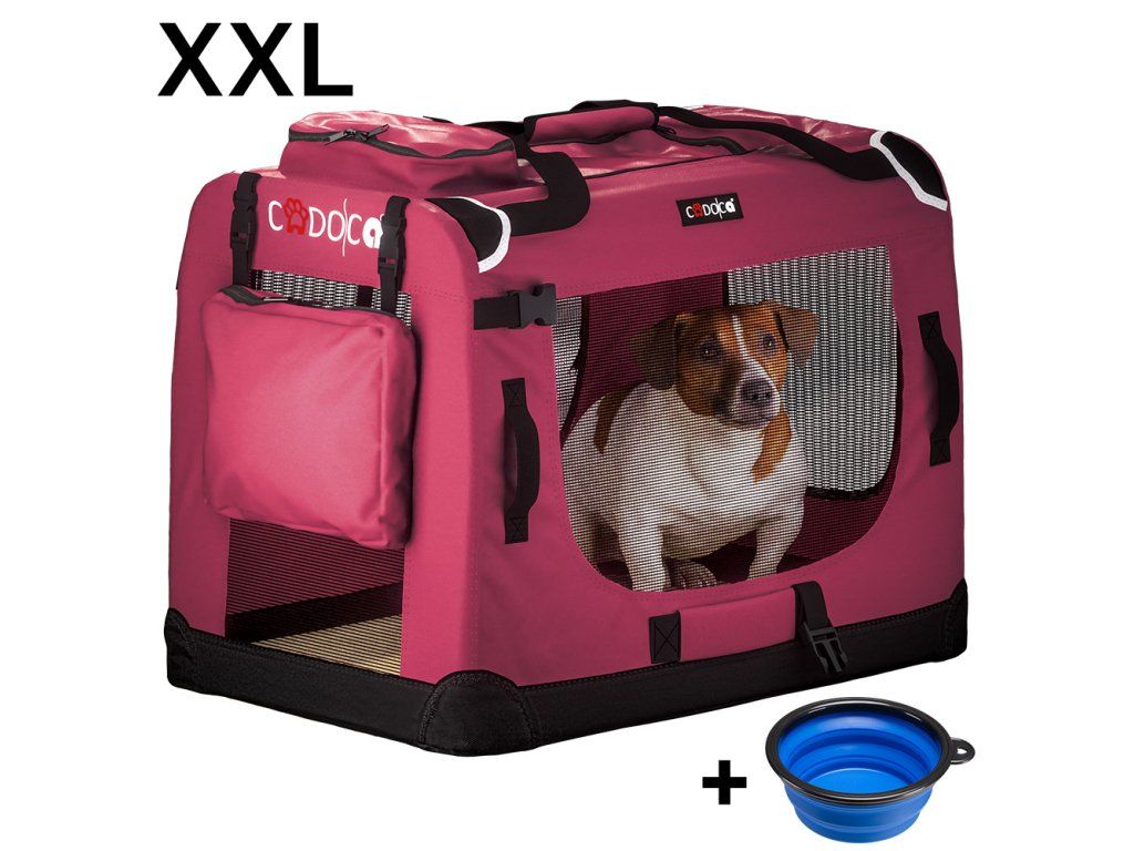 Dopřejte svému mazlíčkovi pohodlí doma i na cestách s touto skládací přepravkou CADOCA® XXL v tmavě červené barvě. S rozměry 90 × 61 × 65 cm je ideální pro střední a větší psy nebo i kočky. Díky měkké polstrované podložce a síťovaným oknům na všech stranách zajišťuje bezpečný a komfortní prostor s dostatečnou cirkulací vzduchu.