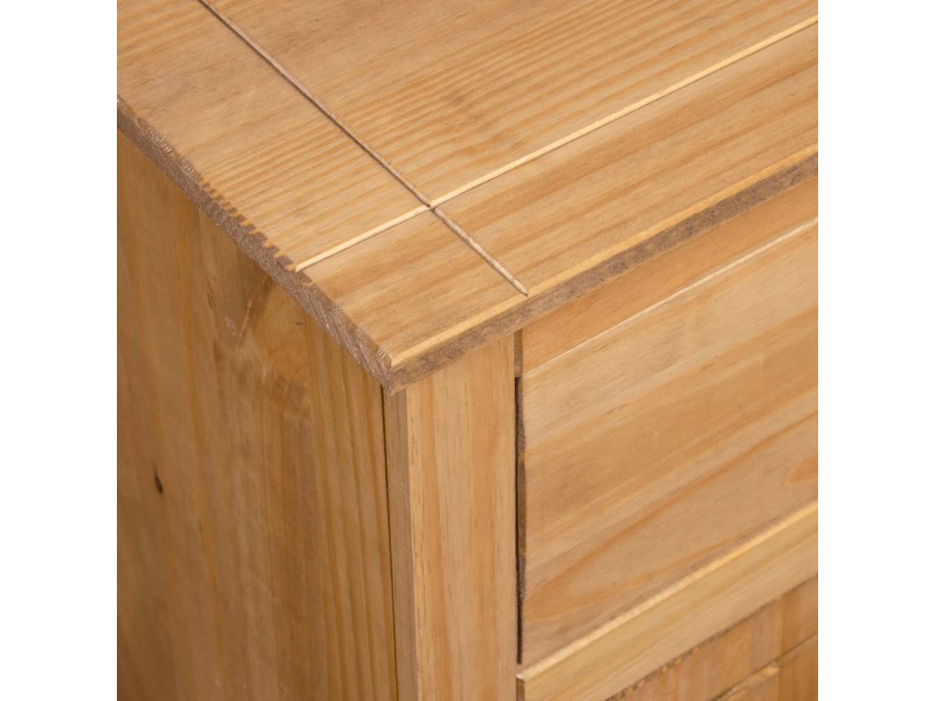 Tato komoda je vyrobená z masivního borovicového dřeva a je mimořádně odolná a robustní. Odkládací skříňka nabízí velký úložný prostor se 3 zásuvkami a 3 přihrádkami. Pevná horní deska se skvěle hodí k vystavení dekorativních předmětů, jako jsou zarámované fotografie, pokojové rostliny, vázy atd. Snadno se otírá suchým hadříkem. Sestavení úložné komody je snadné.