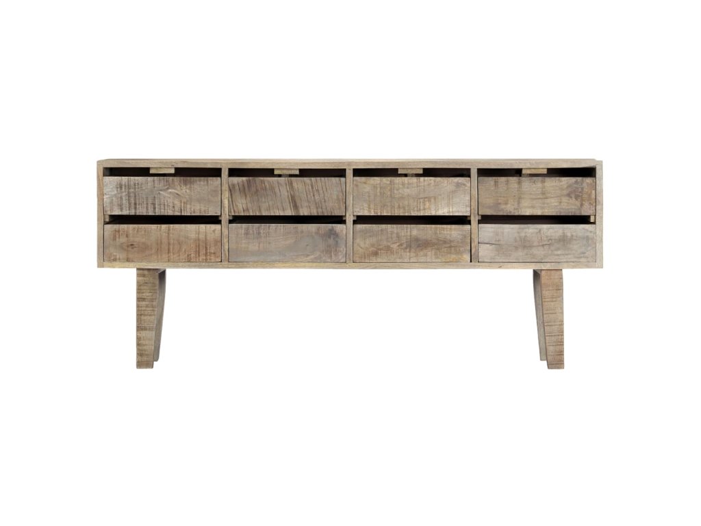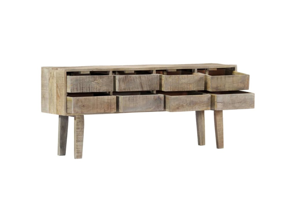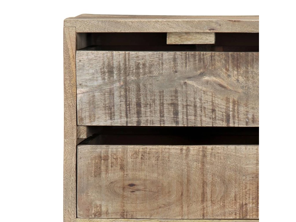 Skříňka je vyrobena z masivního mangovníkového dřeva. Byla naleštěna, natřena a nalakována, aby vynikl její půvabný a rafinovaný vzhled. Mangovník má husté a robustní tvrdé dřevo, jehož povrch se vyznačuje překrásnými hnědými či zlatavými pruhy a liniemi. Sestavení příborníku je snadné a k jeho čištění vám postačí navlhčený hadřík. Povzneste své bydlení na novou úroveň s naší elegantní skříňkou se zásuvkami!
