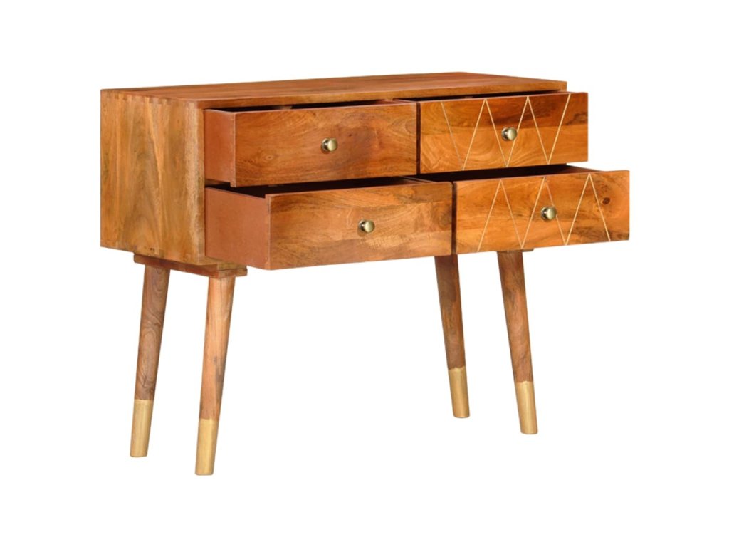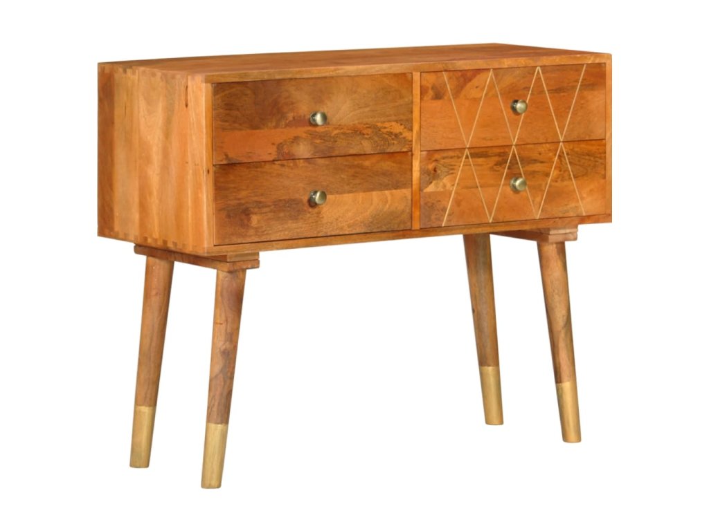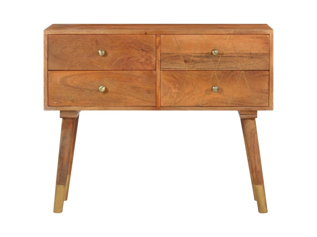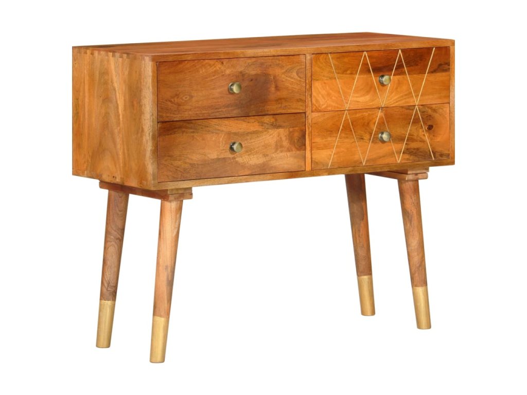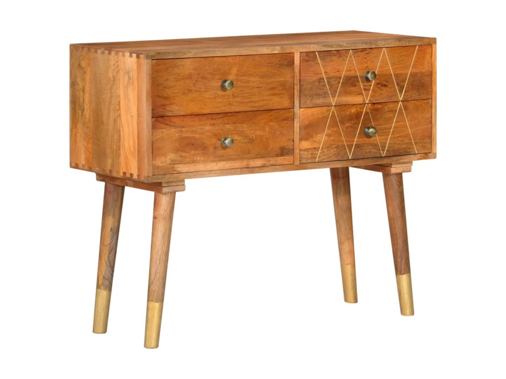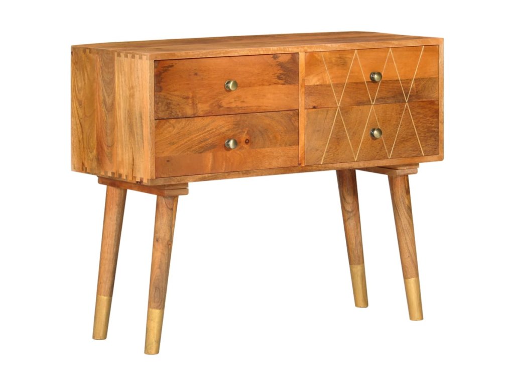 Příborník je vyrobený z masivního mangovníku, což je husté a robustní tvrdé dřevo, jehož povrch se vyznačuje krásnými hnědými či zlatými pruhy a konturami. Nádherná kresba dřeva dává každému kusu nábytku zcela jedinečný charakter, kterým se lehce liší od všech ostatních. Skříňka má pevnou a stabilní horní desku pro vaše košíky s ovocem, vázy či jiné dekorativní předměty. 4 zásuvky vám poskytnou dodatečný úložný prostor. Montáž je snadná.