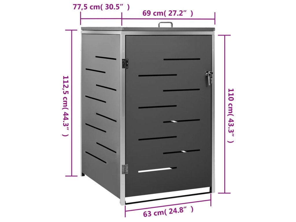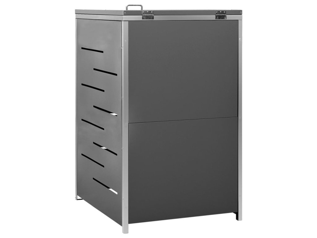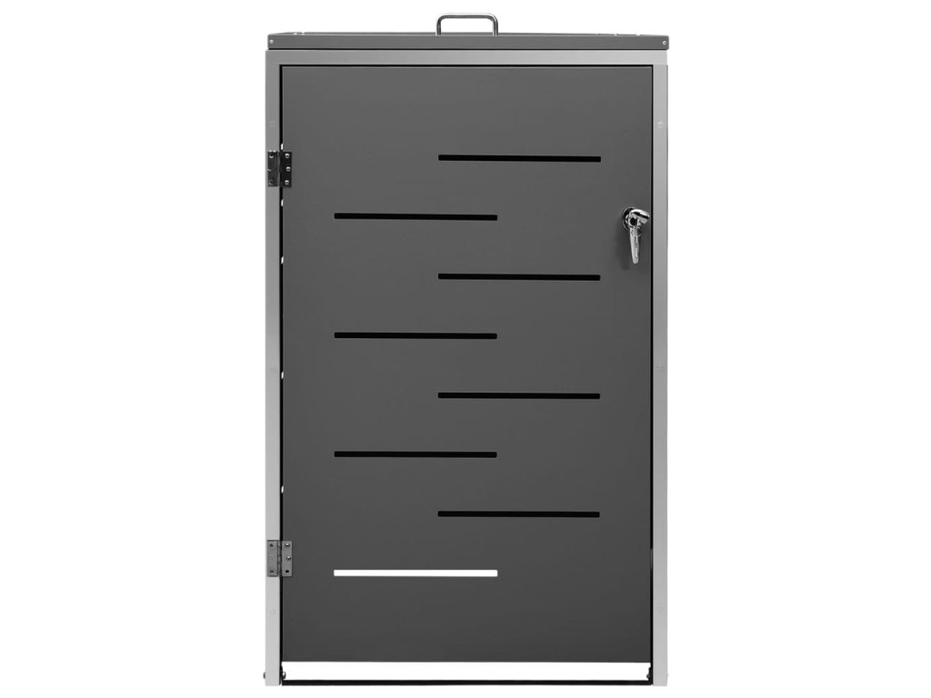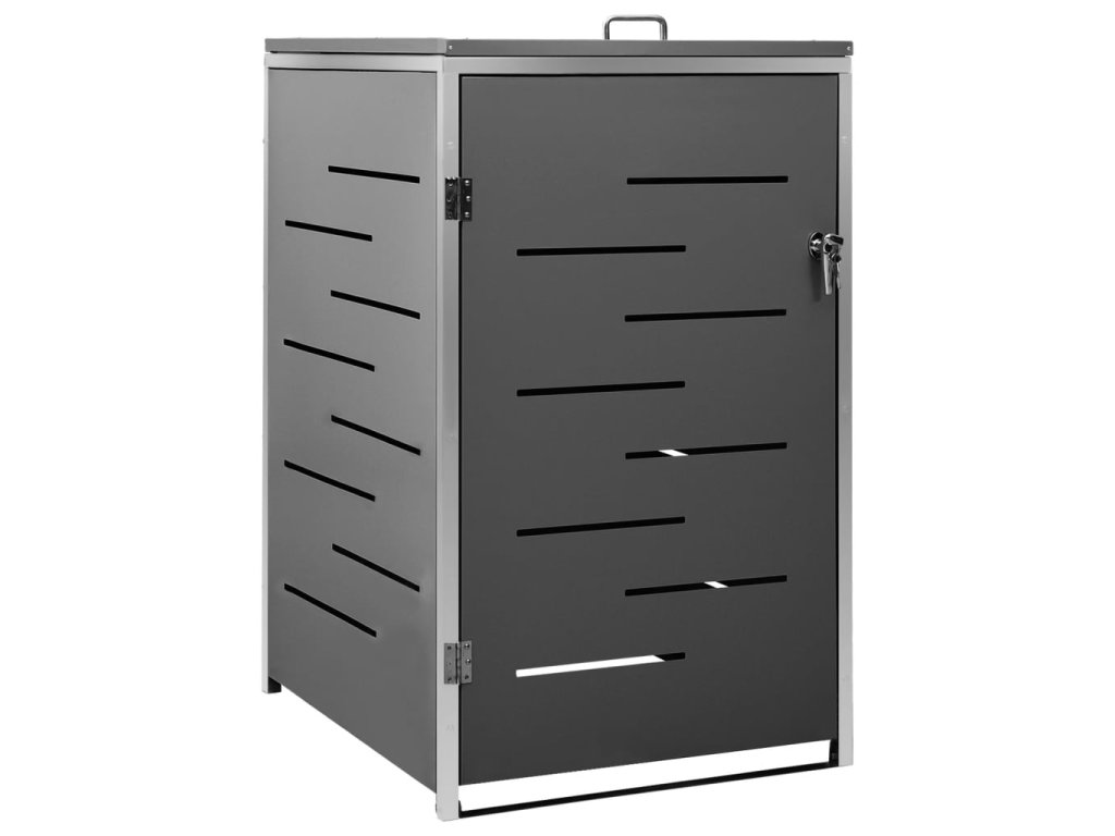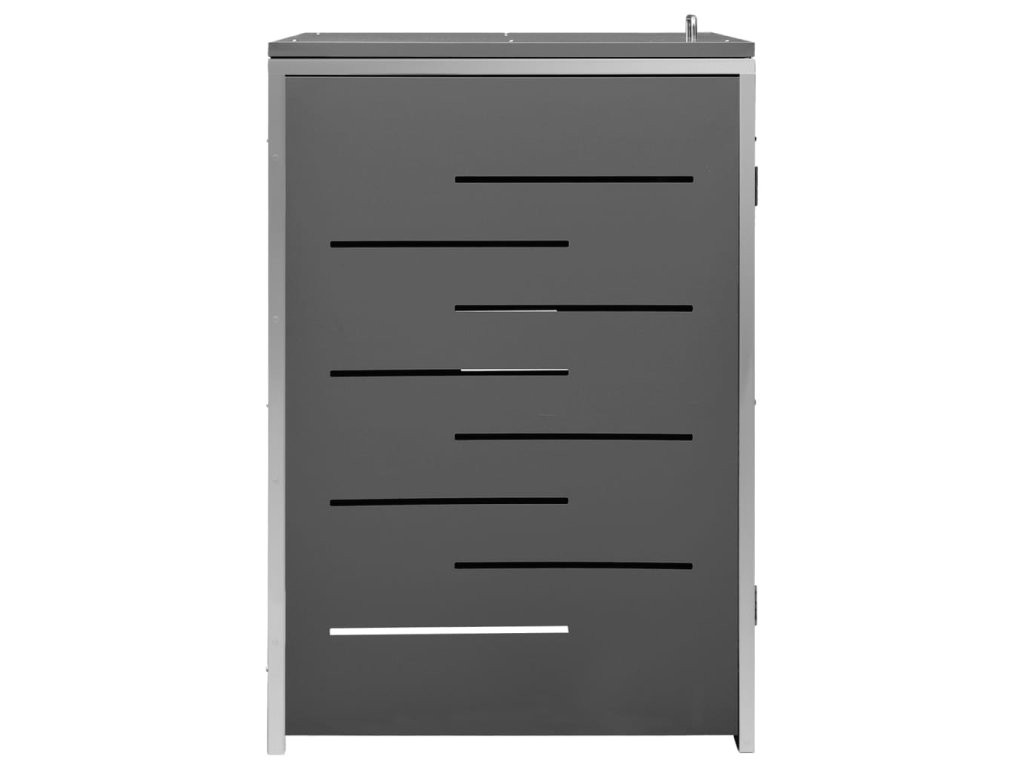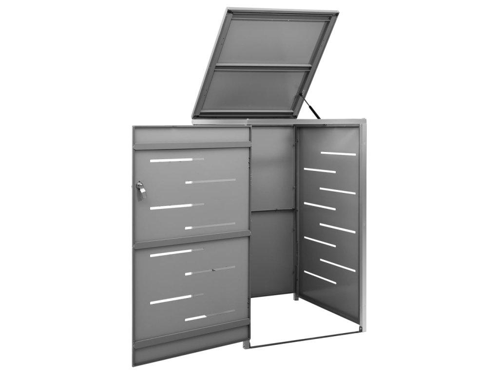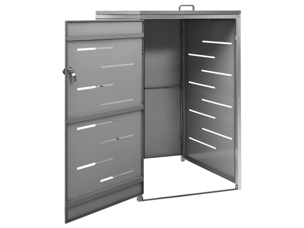 Tento přístřešek na popelnice je vyroben z pozinkovaného ocelového panelu a rámu z nerezové oceli, takže je mimořádně robustní a odolný proti korozi. Dutá konstrukce umožňuje cirkulaci vzduchu a zabraňuje, aby v popelnicích vznikal nepříjemný zápach. Uzamykací systém zároveň zajišťuje bezpečné uložení odpadků. Praktické víko a pružiny navíc usnadňují vkládání a vyjímání popelnic.