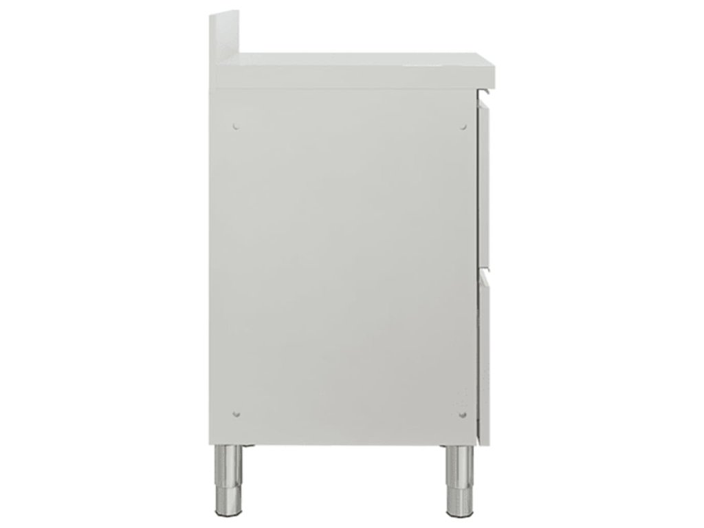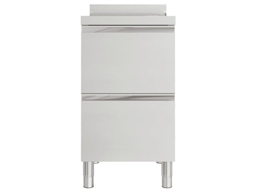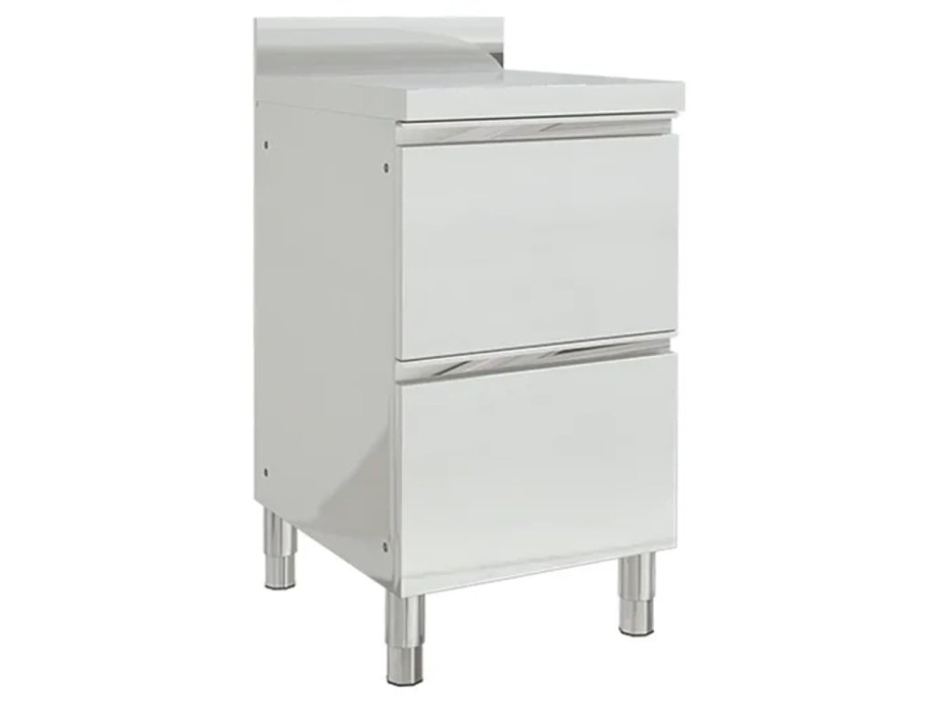 Tato skříňka je vyrobená z kvalitní nerezové oceli a je robustní, antikorozní a snadno se čistí. Dvě zásuvky poskytují dostatek úložného prostoru pro úklidové vybavení a příslušenství. Nastavitelné nožičky umožňují vyrovnat skříňku i na nerovné ploše. Součástí skříňky je 10 cm vysoký zadní lem a otvor na vodní trubku.
