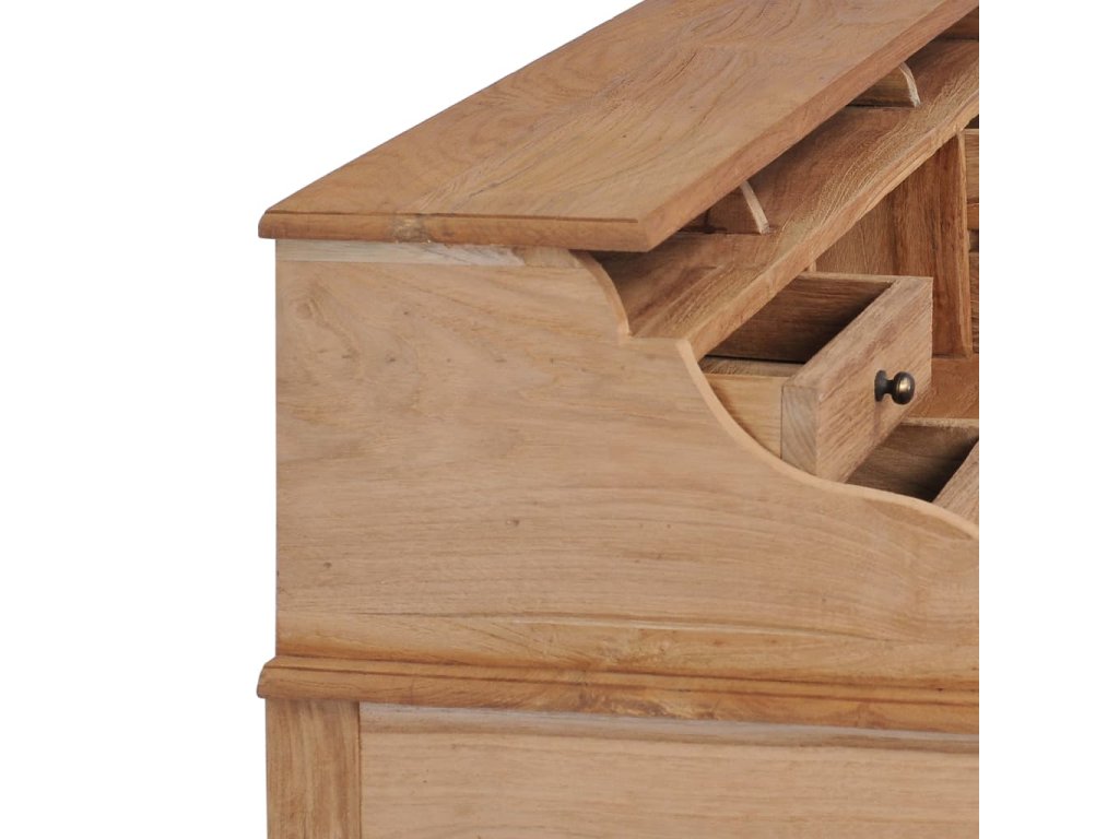 Psací stůl je vyrobený z masivního teakového dřeva. Každá fáze výrobního procesu se provádí s největší péčí, ať už se jedná o leštění, natírání nebo lakování. Vzhledem k řemeslnému zpracování a krásné kresbě dřeva je každý kus nábytku jedinečný a lehce se liší od ostatních. Psací stůl je stabilní, odolný, ale zároveň také esteticky atraktivní. Překrásné ručně vyřezávané detaily a dřevěné nohy jsou důmyslně spojeny do jednoho kusu nábytku. Šest zásuvek a otevřené přihrádky poskytují dostatek prostoru pro uspořádání vašich dokumentů a dalších kancelářských potřeb na dosah ruky.