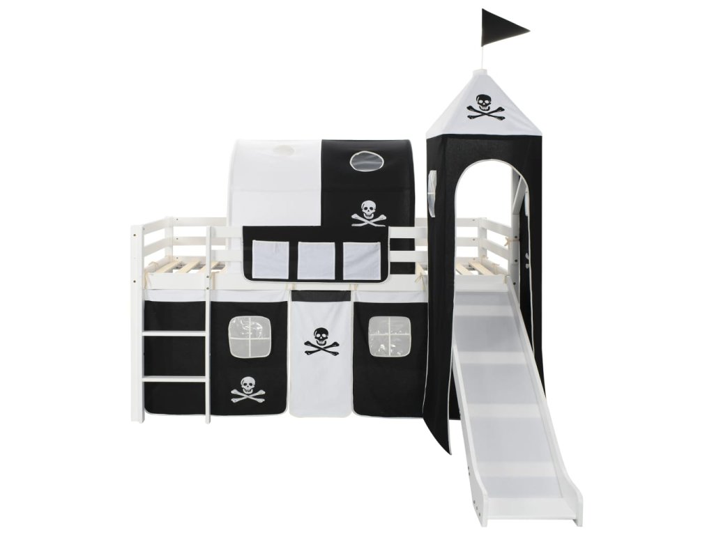 Tato dětská patrová postel s pirátským motivem se stane opravdovým středobodem dětského pokoje. Má robustní konstrukci a obdržíte s ní i laťkový rošt, skluzavku, žebřík a stan s pirátskou tématikou s bočními stěnami a stříškou.