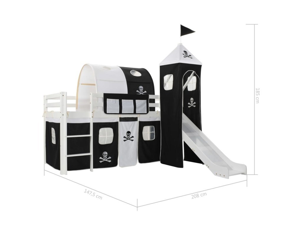 Ochranné zábradlí na obou stranách postele udrží vašeho malého piráta či pirátku bezpečně v pelechu. Prostor pod postelí se promění na kapitánskou kajutu, jen co přidáte dodané boční stěny s okny. Vyvýšená postel disponuje také zábavnou skluzavkou a žebříkem, přičemž se oba prvky dají zakrýt přiloženým stanem. Skluzavku a žebřík je možné sestavit buď vlevo, nebo vpravo, a součástí balení je i baldachýn přes postel. Postel je vhodná pro matrace 90 x 200 cm.