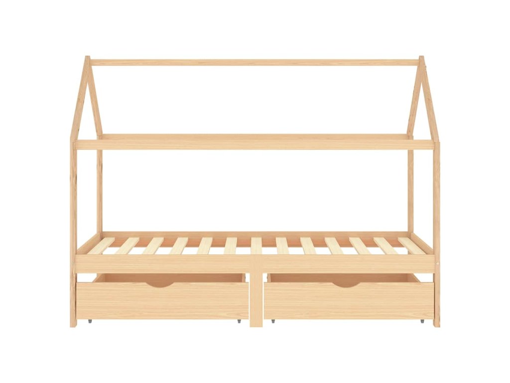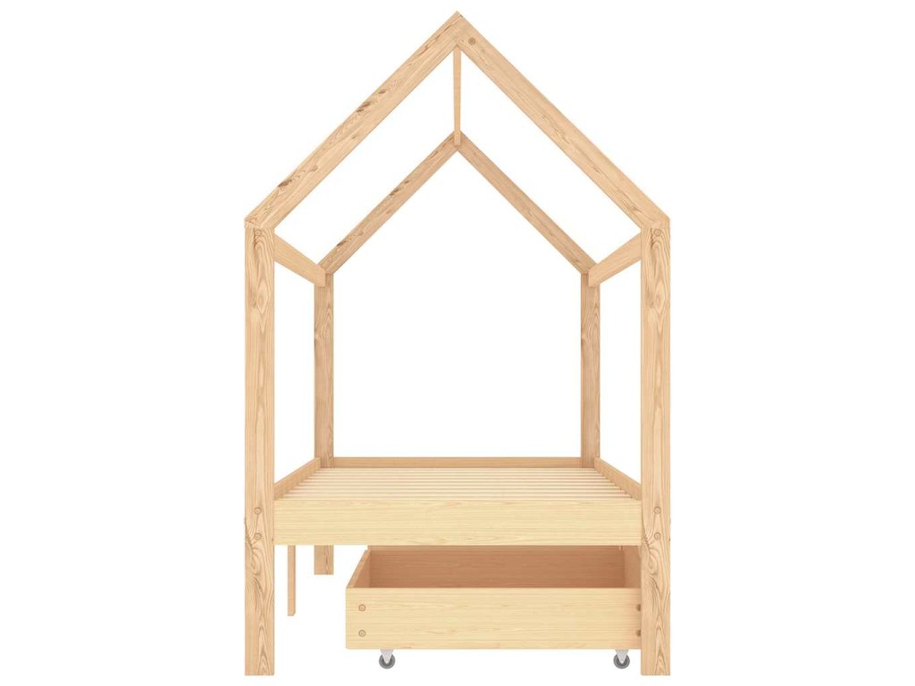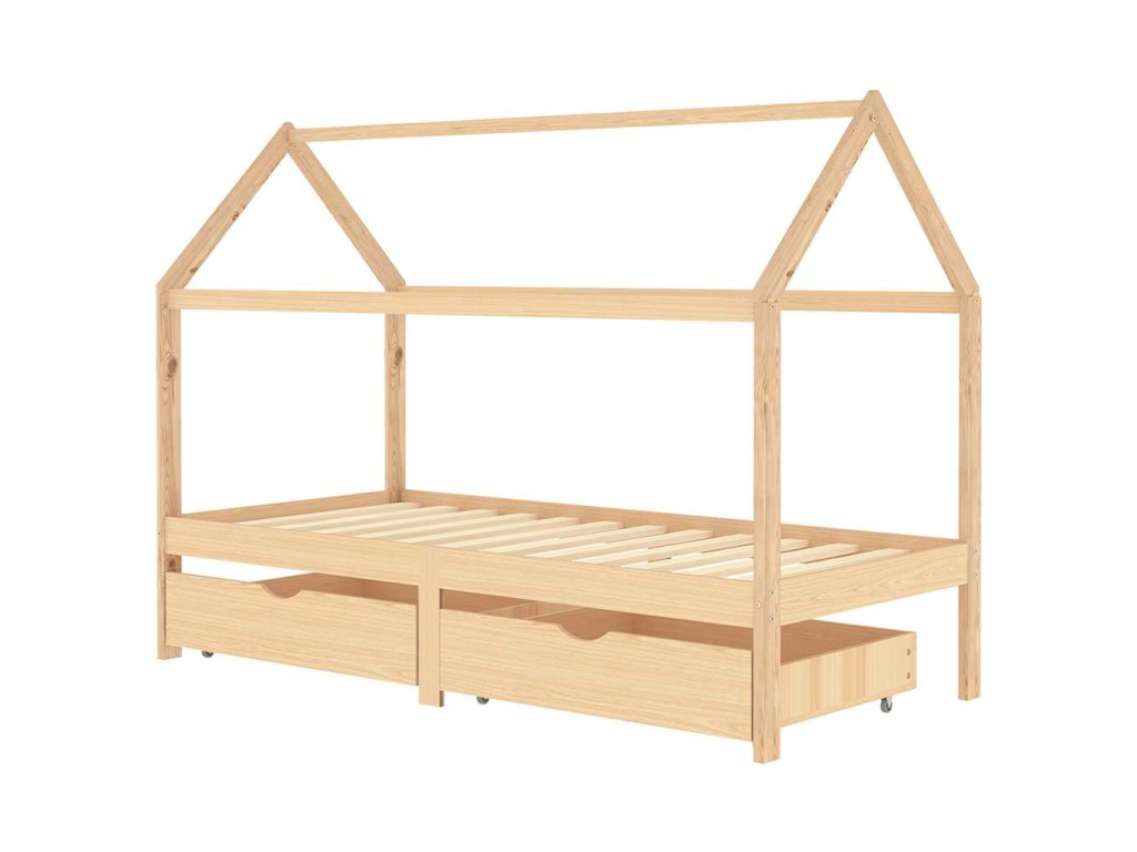 Postel je chytře navržená ve stylu domku na stromě. Chcete-li svému dítěti dopřát trochu soukromí, můžete mu na rám pověsit závěsy. Domeček mu kromě toho skvěle poslouží i jako koutek pro čtení nebo hraní. Rám postele je vyrobený z masivního borového dřeva, je tudíž mimořádně odolný a má dlouhou životnost. Pevné lamely nabízejí potřebnou oporu a zároveň jsou velmi pohodlné. Postel je vybavená zásuvkami, které poskytují dostatek úložného prostoru pro uschování složeného oblečení, hraček apod. Udržuje tak dětský pokoj čistý a uklizený. Kolečka se snadno pohybují na kobercích i dřevěných podlahách. Tento rám postele je vhodný pro matraci o rozměrech 90 x 200 cm.