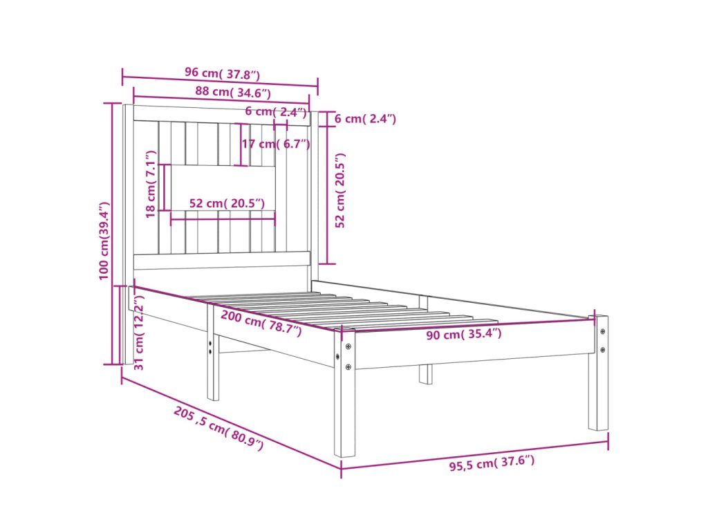 - Rozměry čela postele: 96 x 4 x 100 cm (D x Š x V)