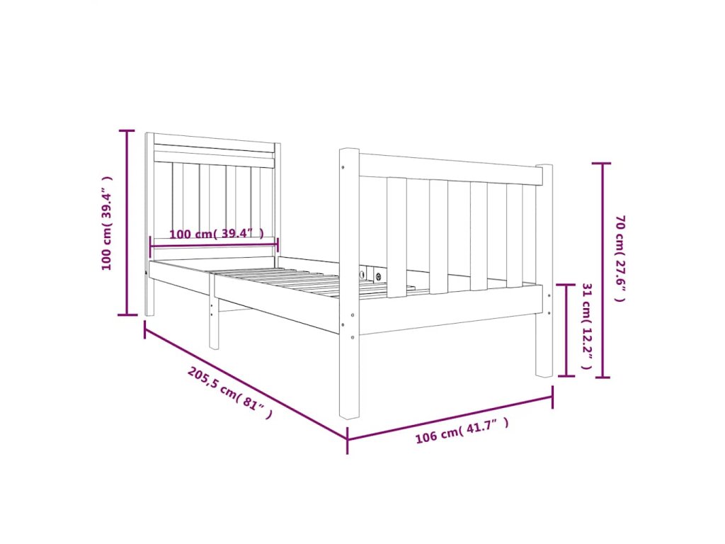 - Celkové rozměry rámu postele: 205,5 x 106 x 100 cm (D x Š x V)